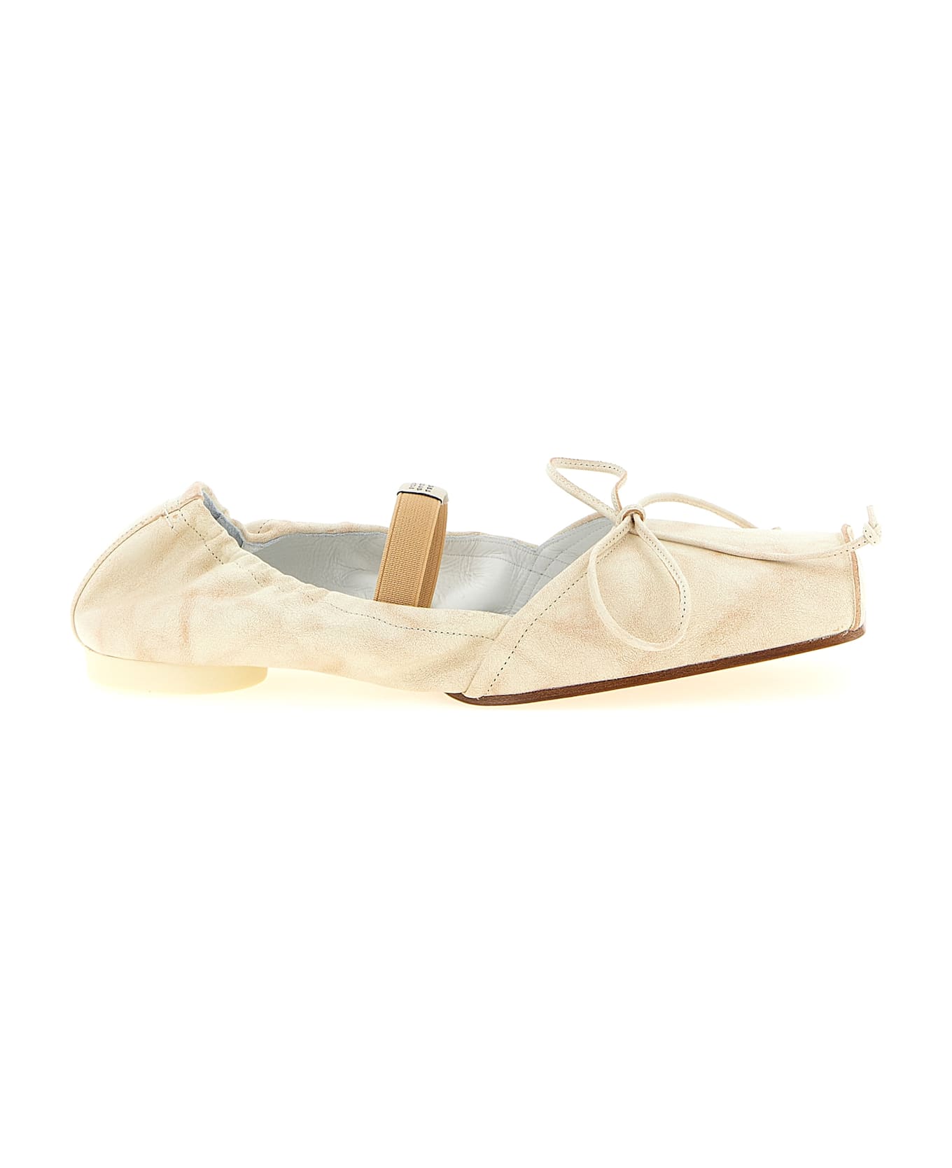 Vintage effect calf leather ballet flats with rigid square toe, tone-on-tone bow on the front, elastic strap with 'Numeric Signature MM6' on the instep, 'White stitch line' and elastic strap on the back, cylindrical rubber heel, leather sole.
