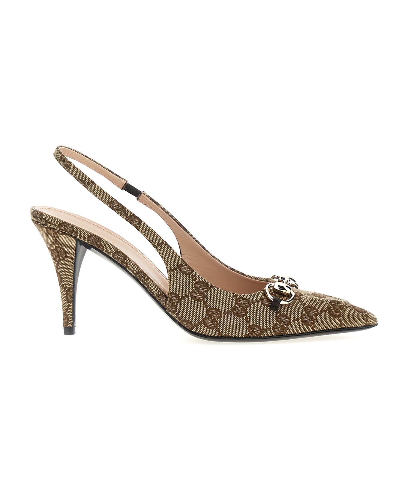Original GG fabric slingbacks, front metal 'Morsetto' appliqué, elastic strap, heel. Composition: 65% polyester 18% cotton 17% polyamide