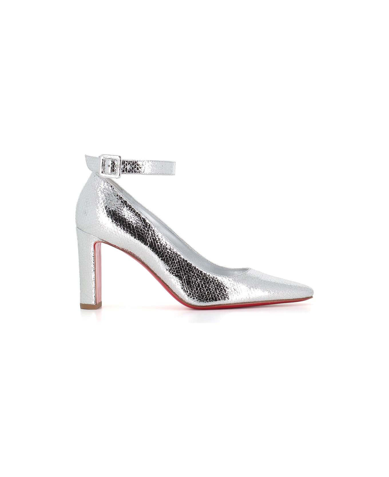Silver metallic effect leather sandal from Christian Louboutin, featuring by a chunky heel and an ankle strap. Leather sole. Heel: 8,5 cm