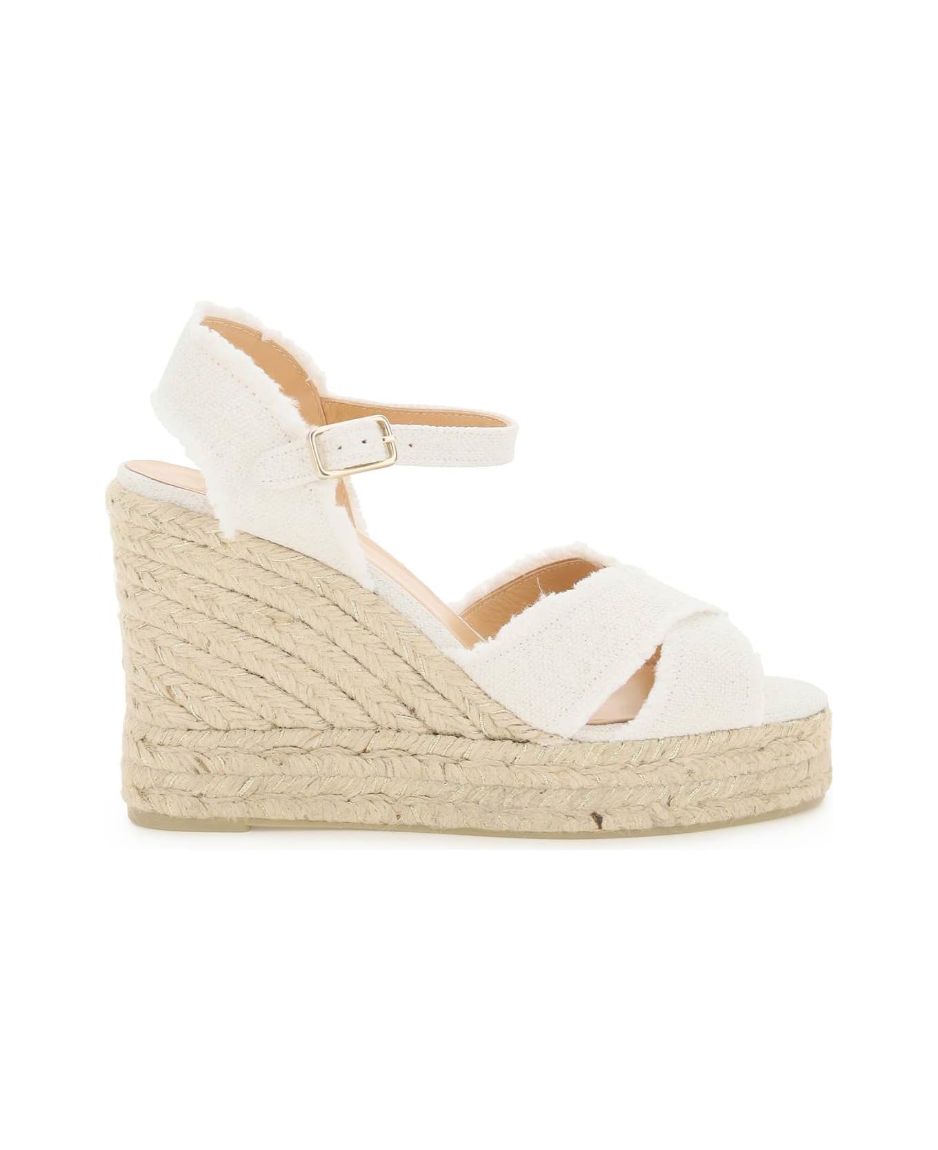 Bromelia handmade espadrilles by Castaner with a crossed upper in linen canvas and golden lurex. Ankle strap with gold-finish metal side buckle, wedge covered in braided rope with lurex details, leather interior, rubber sole.