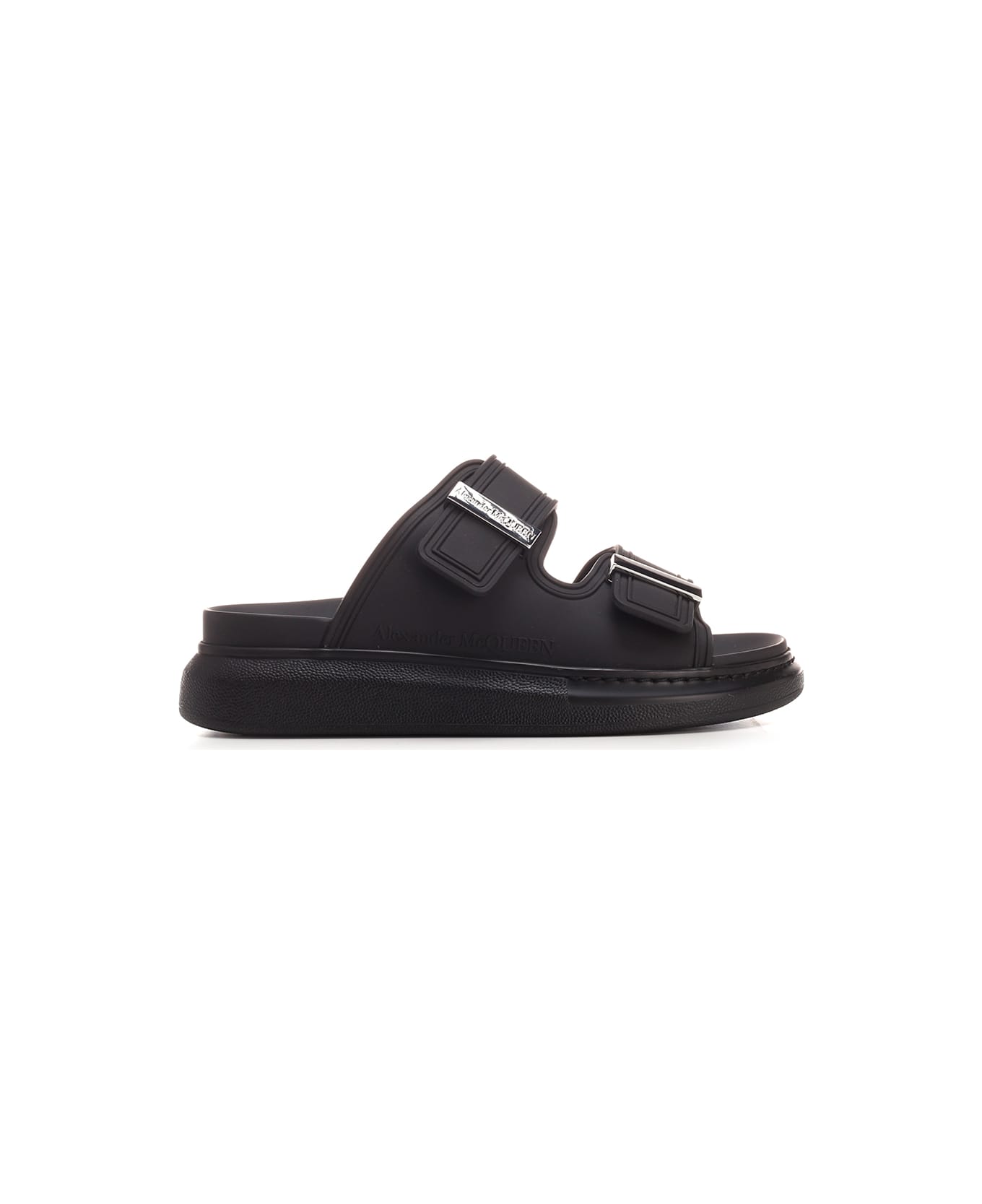 'Hybrid' sandals from Alexander McQueen in black calfskin with silver metal accessories and oversized rubber sole. Round toe, double velcro strap. Composition: UPPER: 100% Rubber; SOLE: 100% Rubber