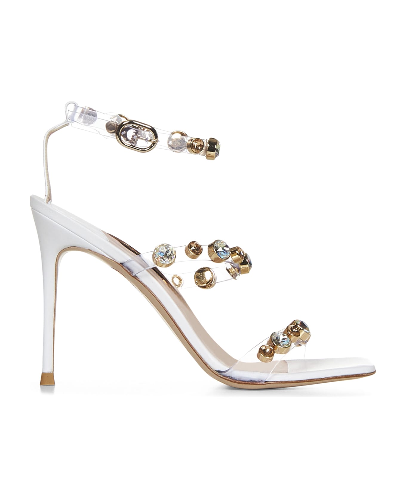 • Adjustable clear vinyl ankle strap with multicolor glass gems, golden metal buckle