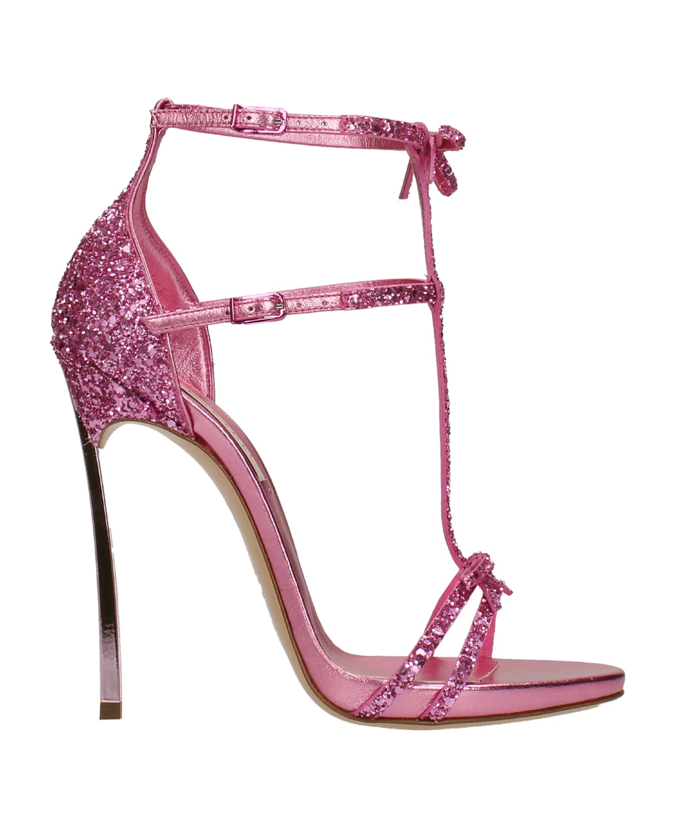 Sandals in fuxia leather, two straps, glitter detail, bow detail, two ankle strap, blade heel, 125 mm heel, Made in Italy
