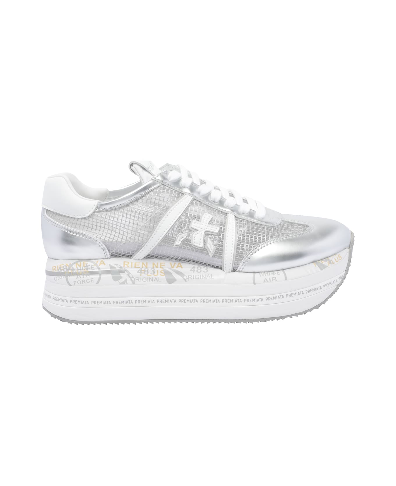Premiata silver Beth platform sneakers, round toe, lateral logo, platform logo sole, leather and fabric upper