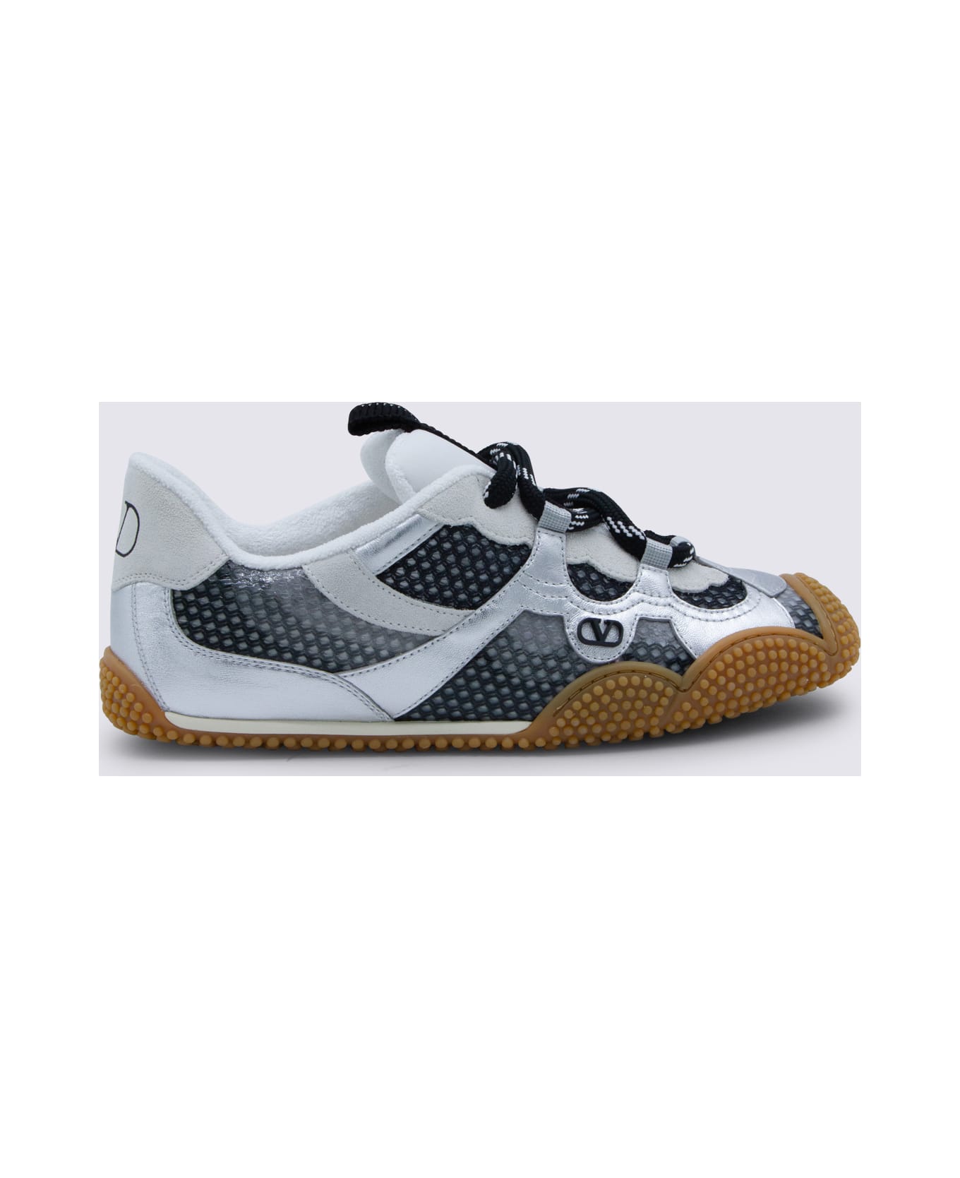 White and black leather Amphibia sneakers from Valentino Garavani featuring round toe, cotton lace-up fastening, lateral logo rubber detail, logo detail on the abck, striped fabric pull tab and custom rubber sole with scallops pattern. Composition: _cover Tex/le Sole, 100% Elastodiene