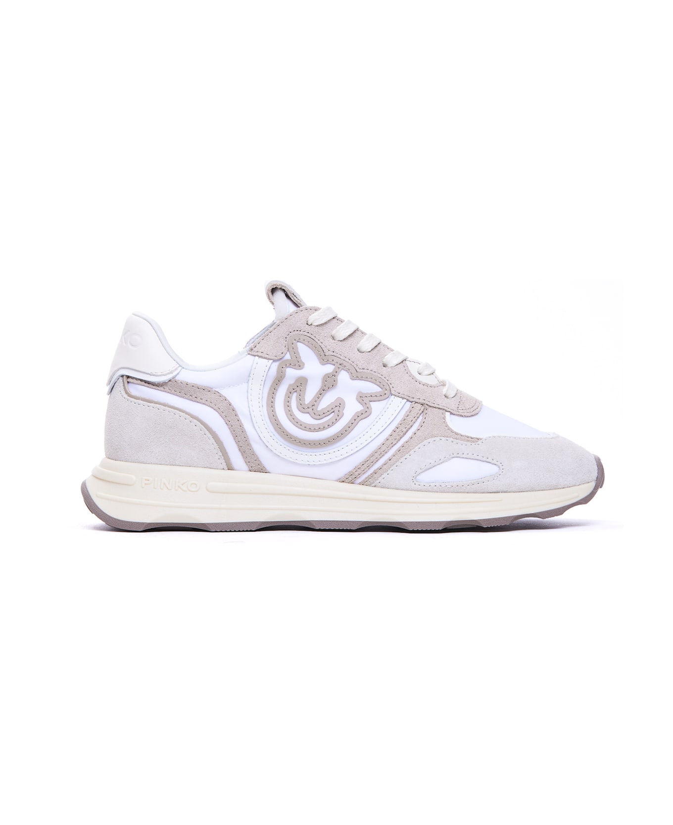 Pinko beige and white Zoe sneakers, fabric and suede upper, round toe, laces closure, logo