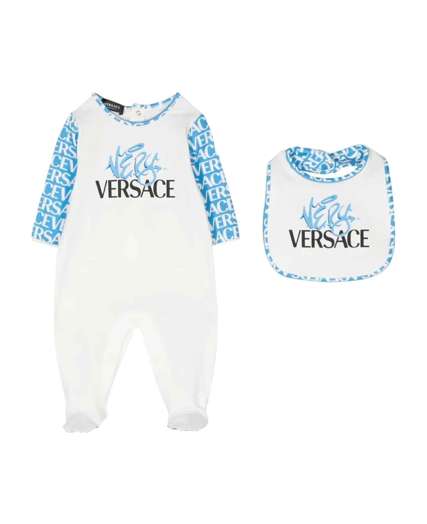 White/blue set baby unisex Kids. logo print to front, logo print to sleeve, sock design, round neckline, back snap button closure, long sleeves, one-piece design, logo trim, round neckline, and back snap button closure. Cotton 94%, Spandex/Elastane 6%