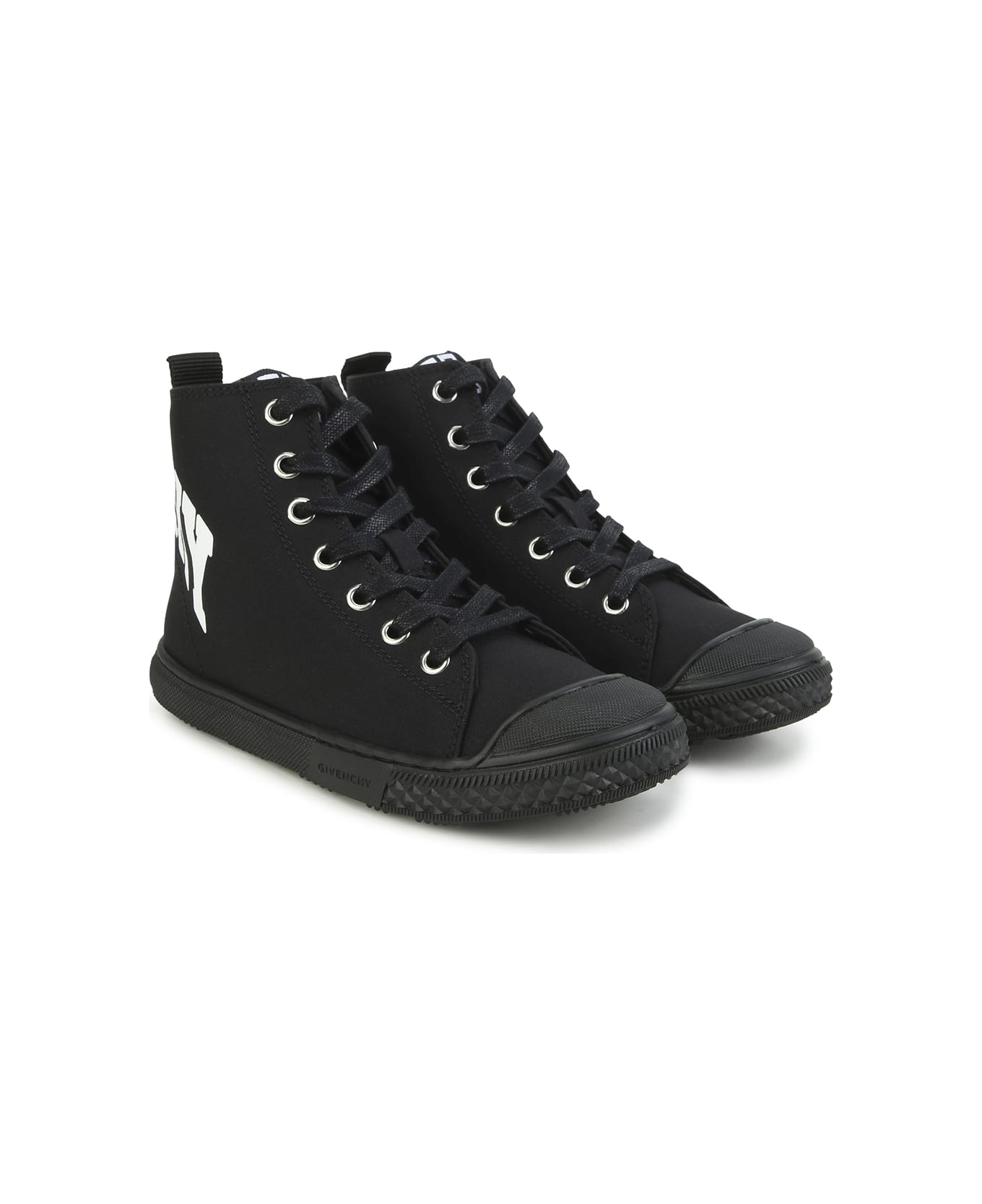 GIVENCHY Kids high-top sneakers made of black calfskin leather and featuring a lace-up design, 4G motif, round rubber toe, black rubber sole, contrasting logo print on the back and logo appliqué on the tongue.
