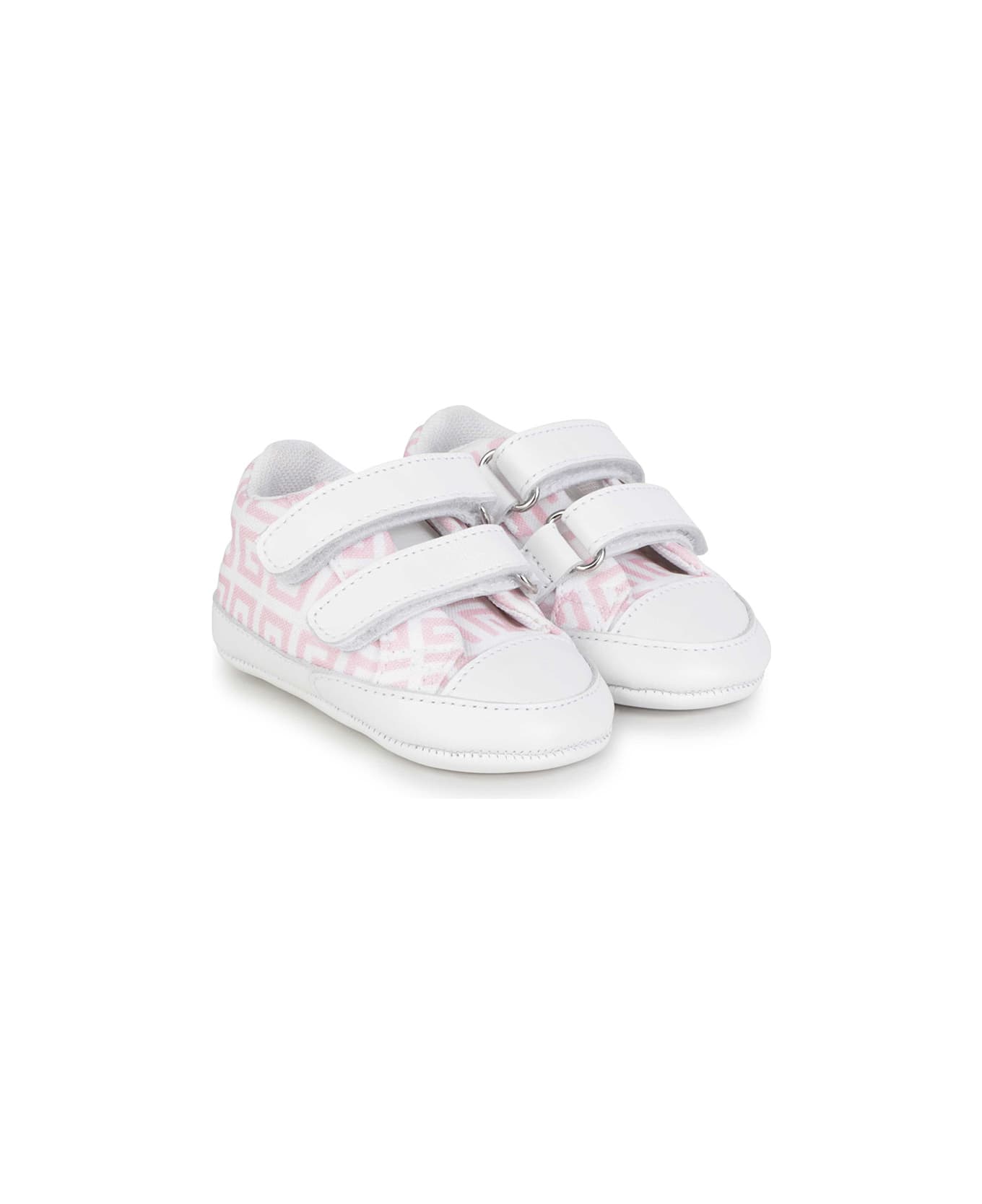 GIVENCHY Kids sneakers made of white jacquard canvas with pink 4G pattern, white leather insert on the front and GIVENCHY label on the heel. Closure with two pull-on straps. The item is sold in a GIVENCHY box.