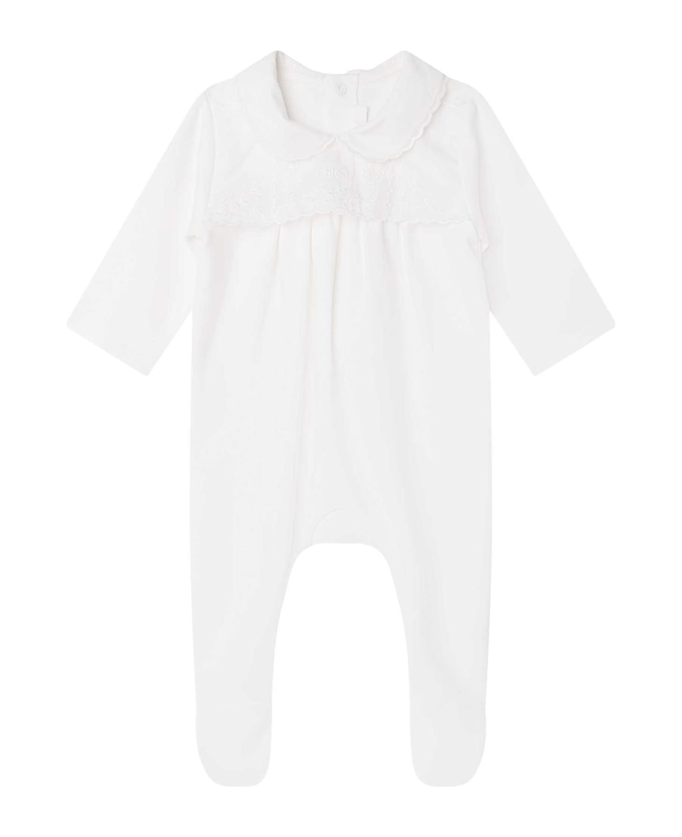 organic cotton embroidered pyjamas from CHLOÉ KIDS featuring off-white, organic cotton, embroidered design, pleat detailing, Peter Pan collar, rear press-stud fastening and long sleeves. Conscious: This item is made from at least 50% organic materials.