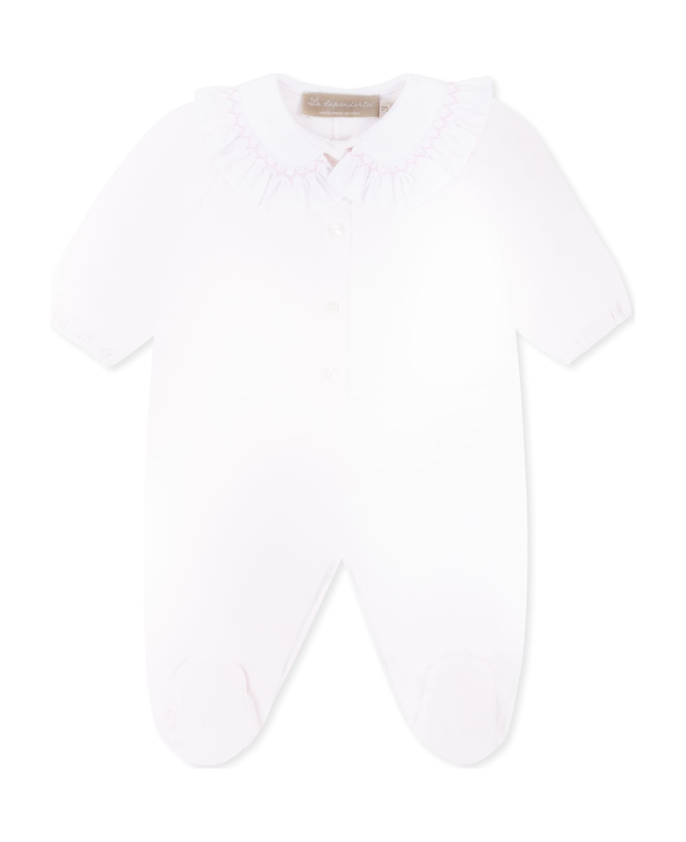 Pink piqué cotton babygrow, with long sleeves, white collar with ruffles and embroidery, snap button fastening on the front and between the legs, feet and elastic cuffs.