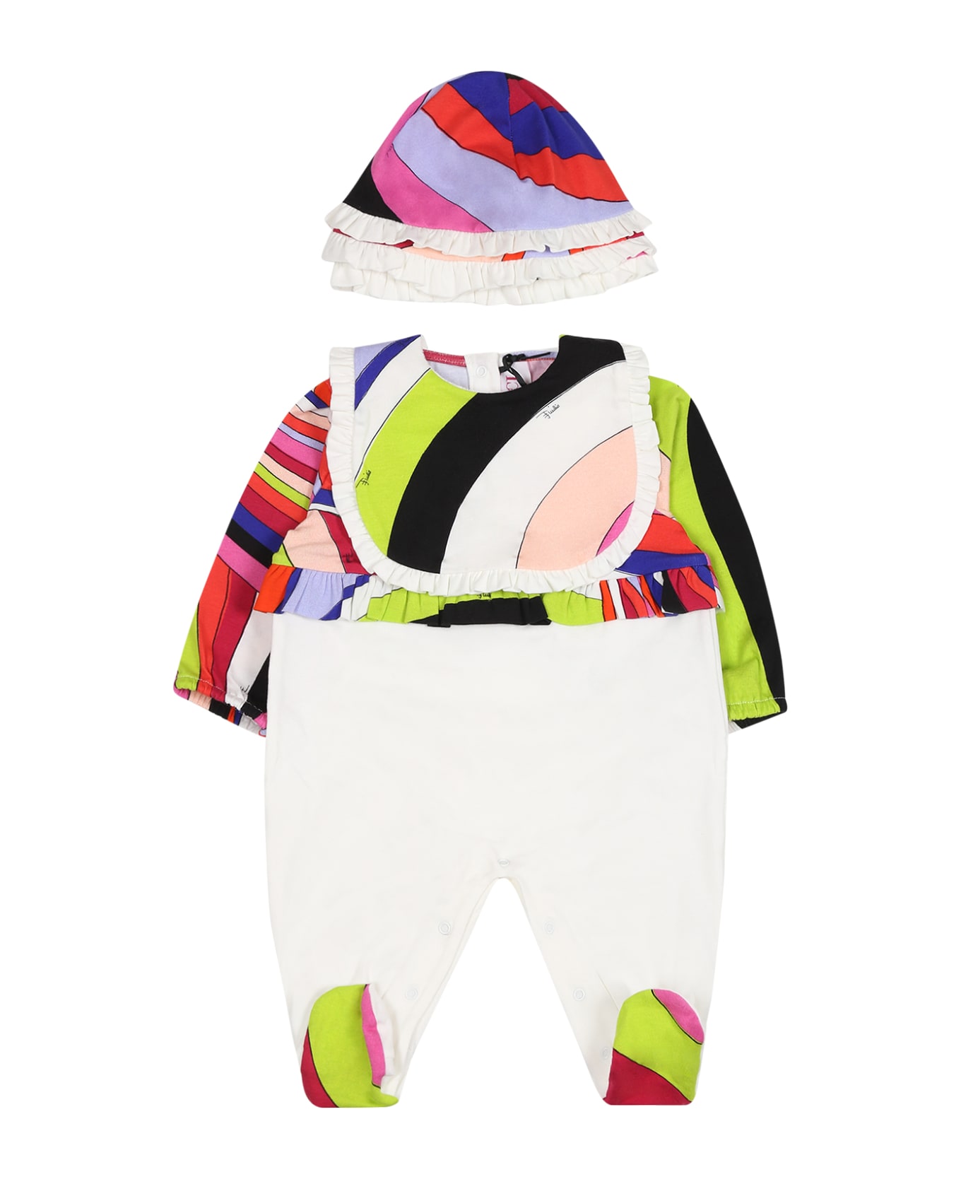 White set in cotton, composed of babygrow, bib and hat; babygrow with long sleeves, peter pan collar, feet, snap button fastening on the back and between the legs, ruffles on the back and on the back. Bib with snap button closure on the side and ruched hem. Hat with ruffles. They are embellished with the iconic multicolor print and logo.