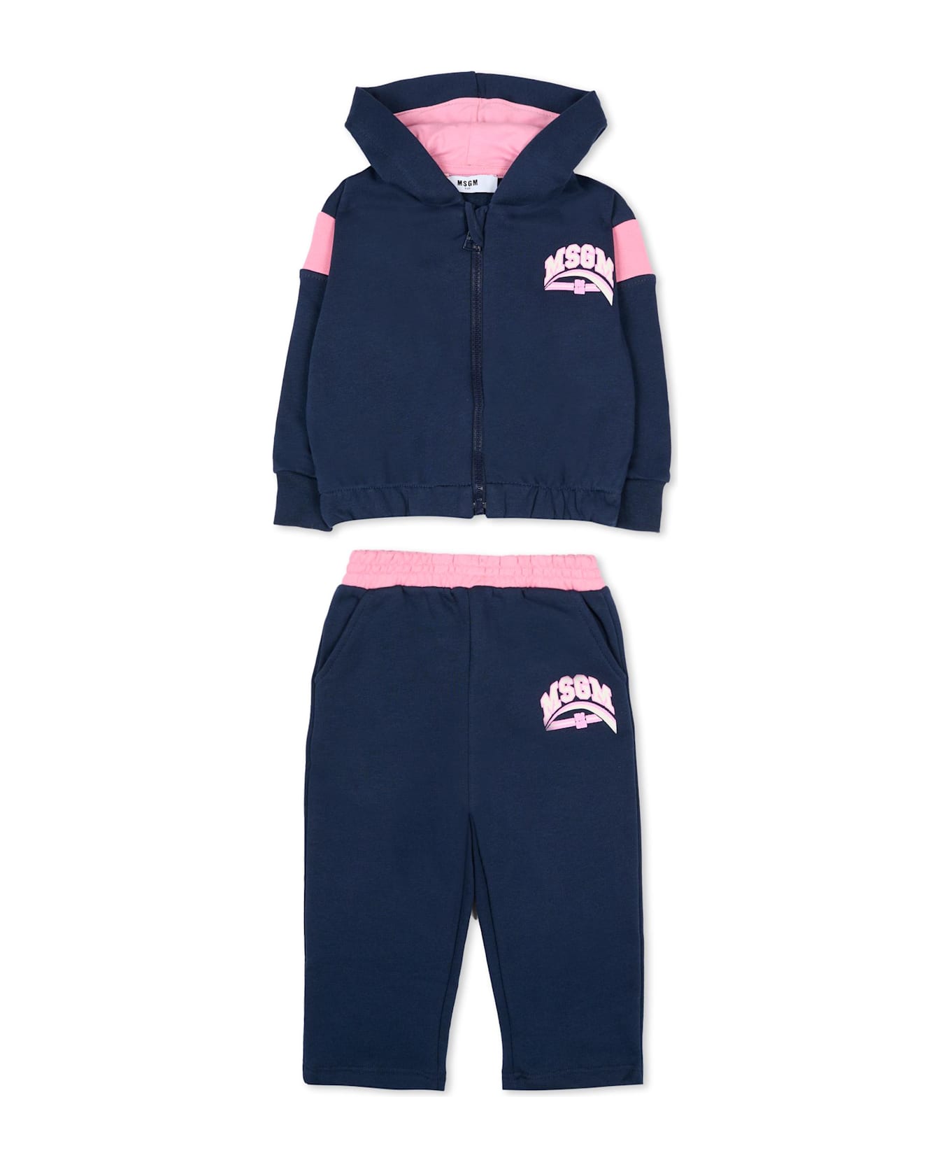 Blue cotton blend sweatshirt and trousers set. Hooded sweatshirt, with long-sleeves, zip fastening, pink details on the sleeves, ribbed cuffs, and an elasticated hem. Trousers with an elasticated waist and side pockets. The outfit is embellished with a rubberized logo on the back and front.