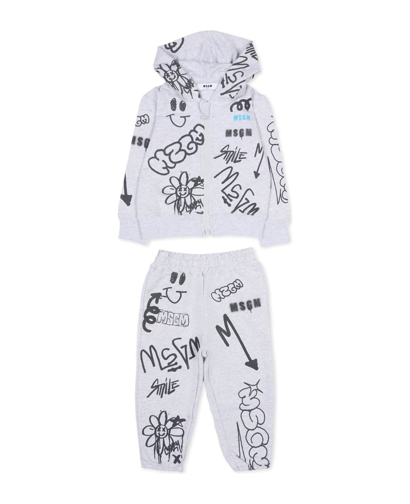 Grey suit composed ofsweatshirt and trousers made of fleece cotton. The hoodie features long sleeves, ribbed hem and cuffs, and a zip closure. The trousers have an elasticated waist and ribbed cuffs. The suit is embellished with an embroidered logo on the chest and an all-over graffiti print.
