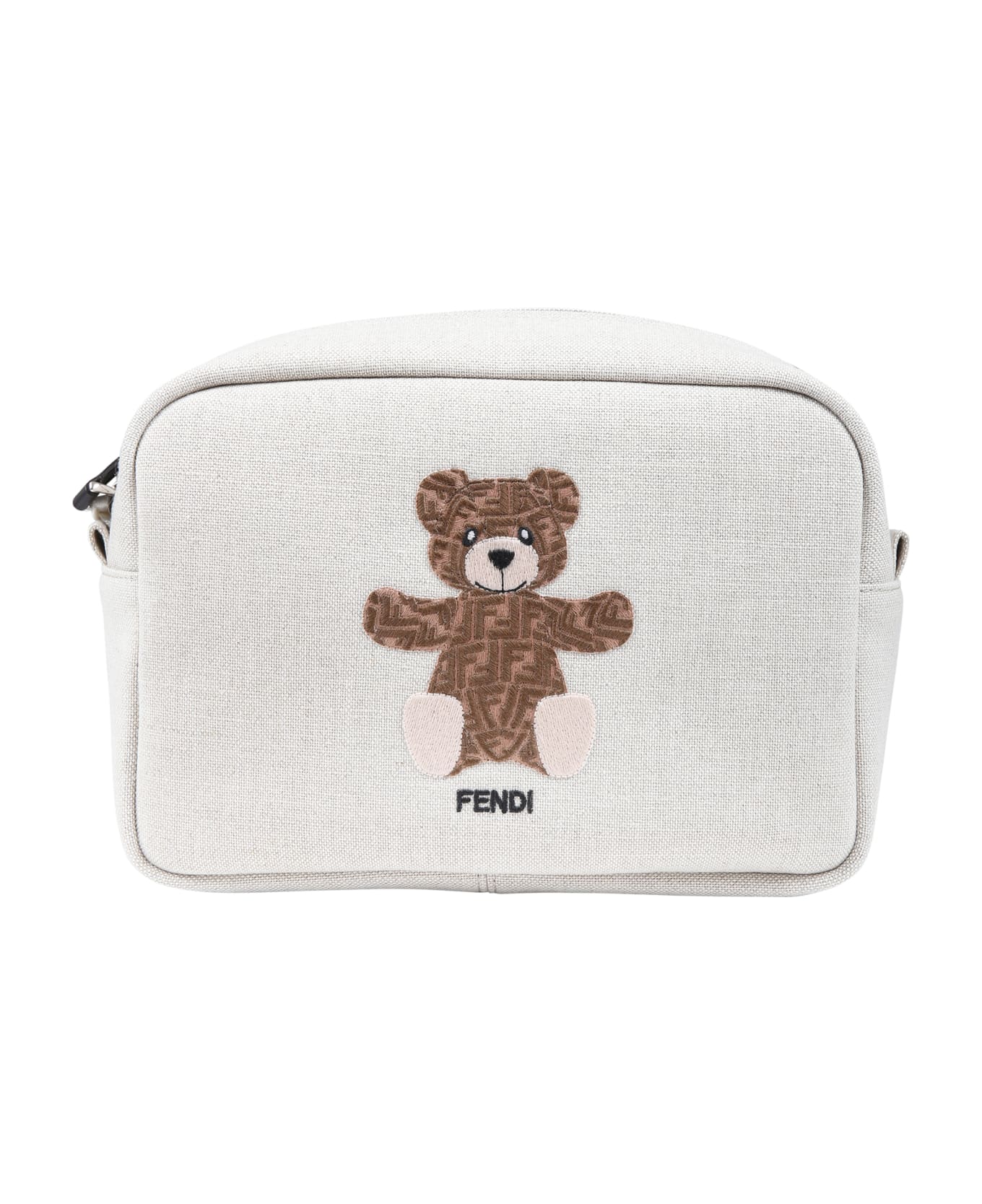 Beige clutch bag in canvas, with zip closure on the top. It is embellished with embroidered bear, double F and logo, on the front. 23 x 18 x 9cm.