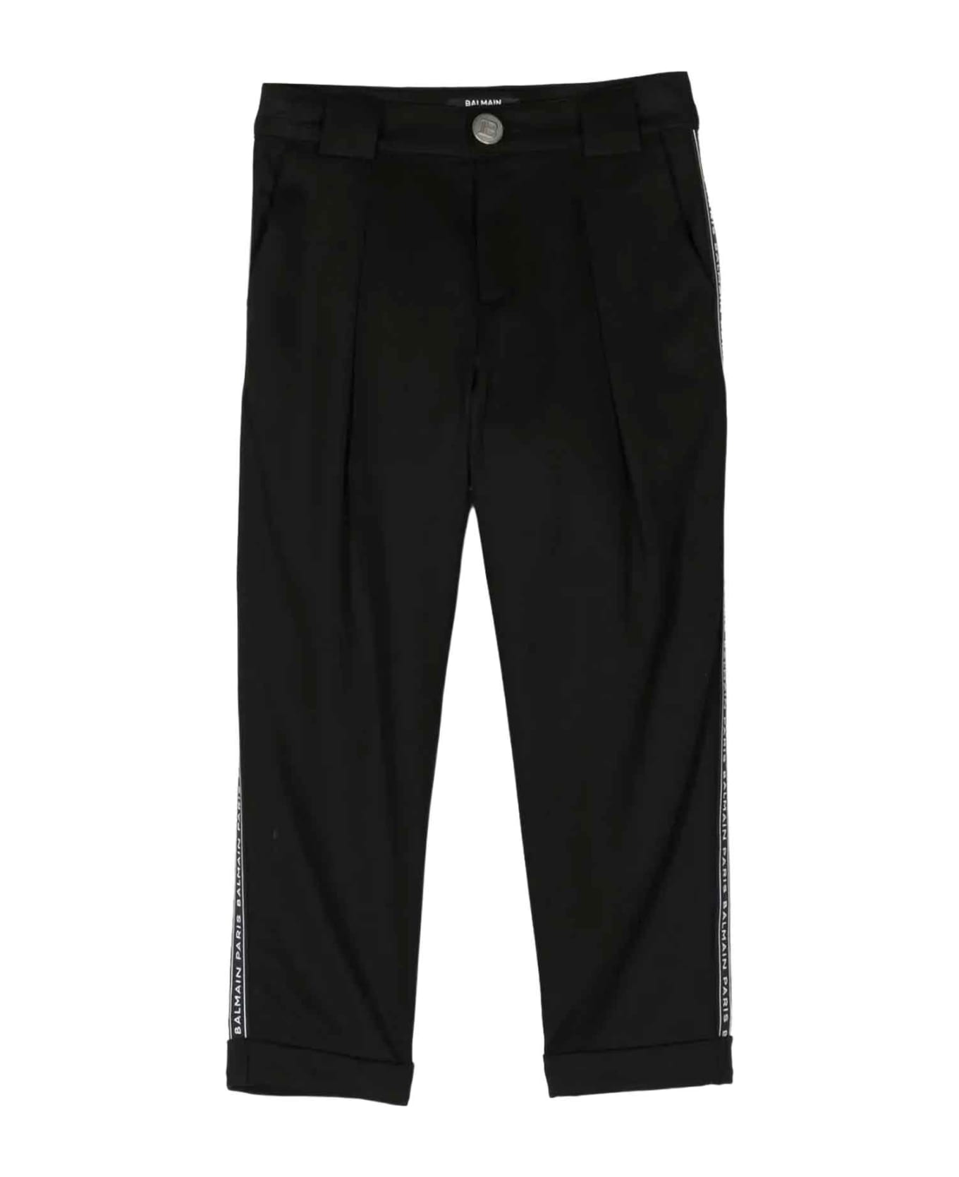 Black trousers boy. Side logo print, side stripe detail, buttons with embossed logo, belt loops, button fastening, zip fly, pleated detail, two side slanted pockets, two hidden back pockets and cuffed hem. Viscose 68%, Polyamide 28%, Elastane 4%