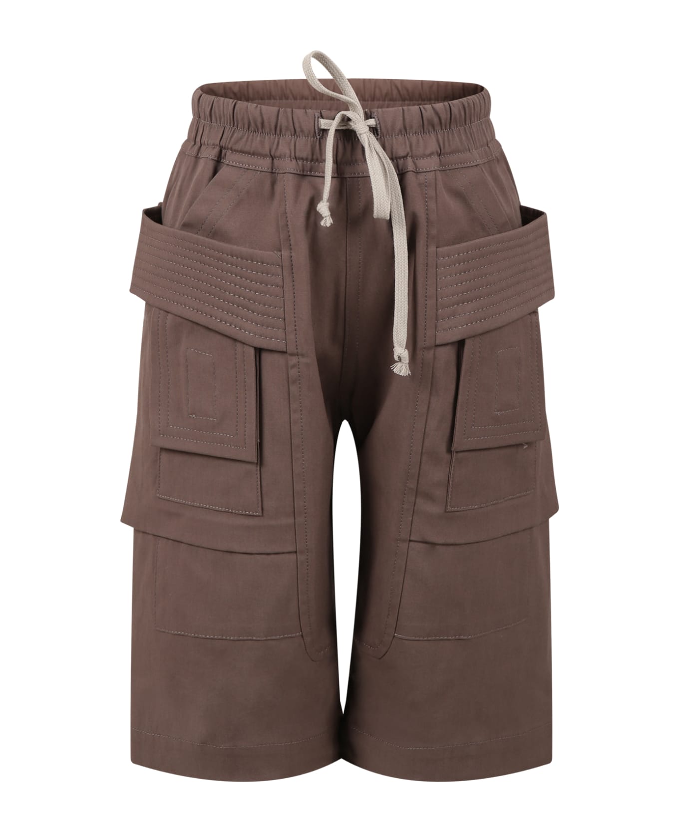 Brown shorts, with elastic waistband and drawstring, side pockets, back pockets and front pockets with flap and velcro.
