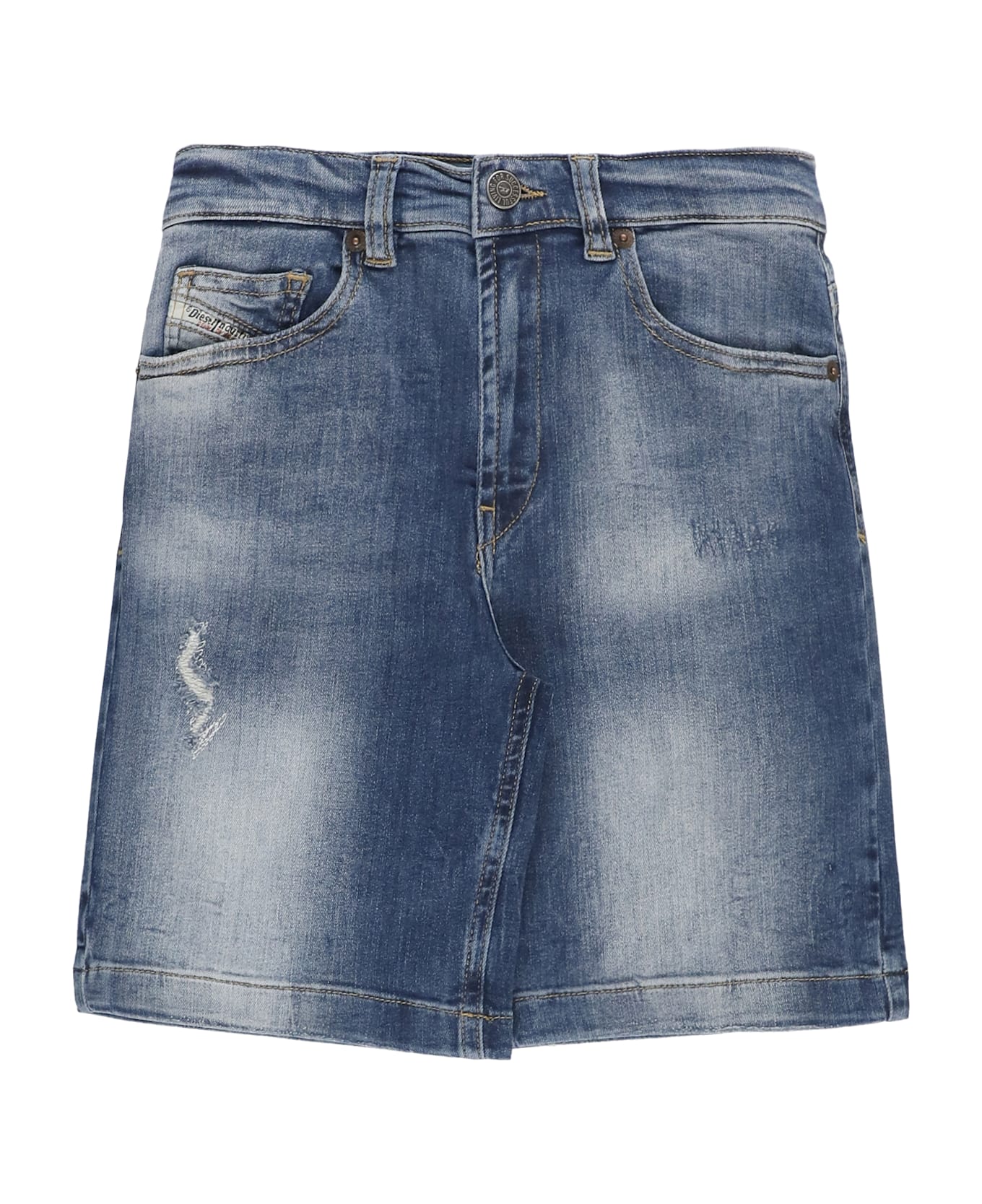 - Blue Diesel Kids cotton shorts for boy - Front zip and button fastening - Five pockets - Rear contrasting colour and fabric loged tab - All-over ripped details