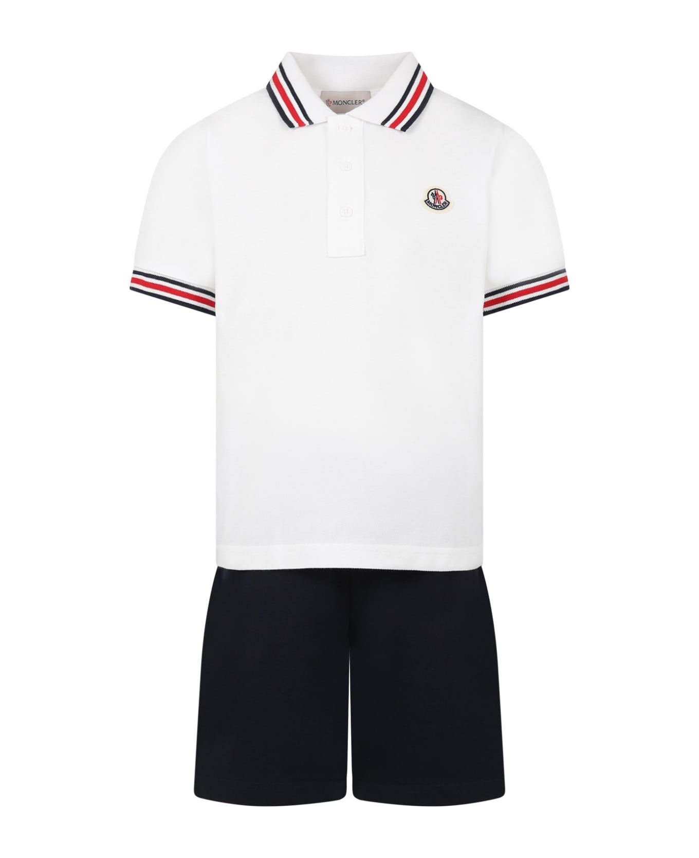 Multicolor suit, in cotton, composed of polo shirt and shorts; white polo shirt, with short sleeves, collar, button closure, on the front. It is embellished with logo patch on the chest, red and blue details on the collar and on the sleeves; shorts with elastic waist, decorated with logo patch, on the back.