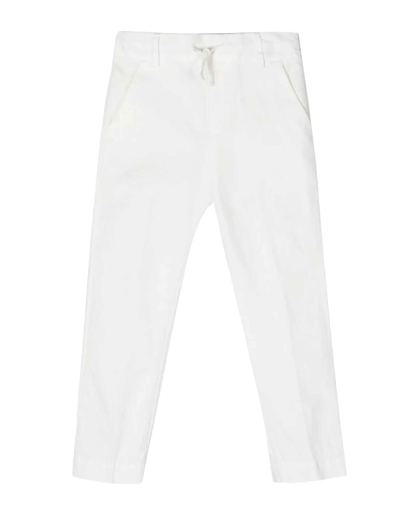 White trousers boy. Waist with elasticated drawstring, belt loops, two diagonal side pockets, two back welt pockets and straight hem. Cotton 63%, Linen 35%, Spandex/Elastam 2%