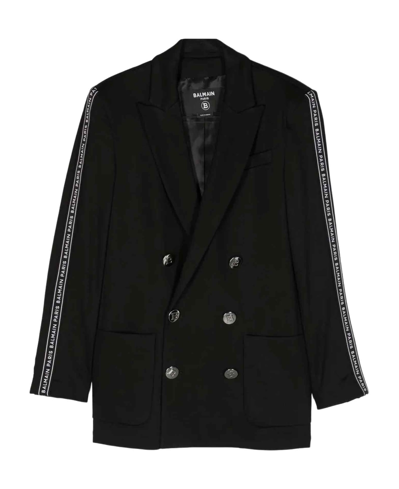 Black jacket boy. Lightweight design, logo band, silver-tone embossed buttons, notch lapels, chest welt pocket, two front patch pockets, double-breasted button fastening, long sleeves, buttoned cuffs and a straight hem. Viscose 68%, Polyamide 28%, Elastane 4%