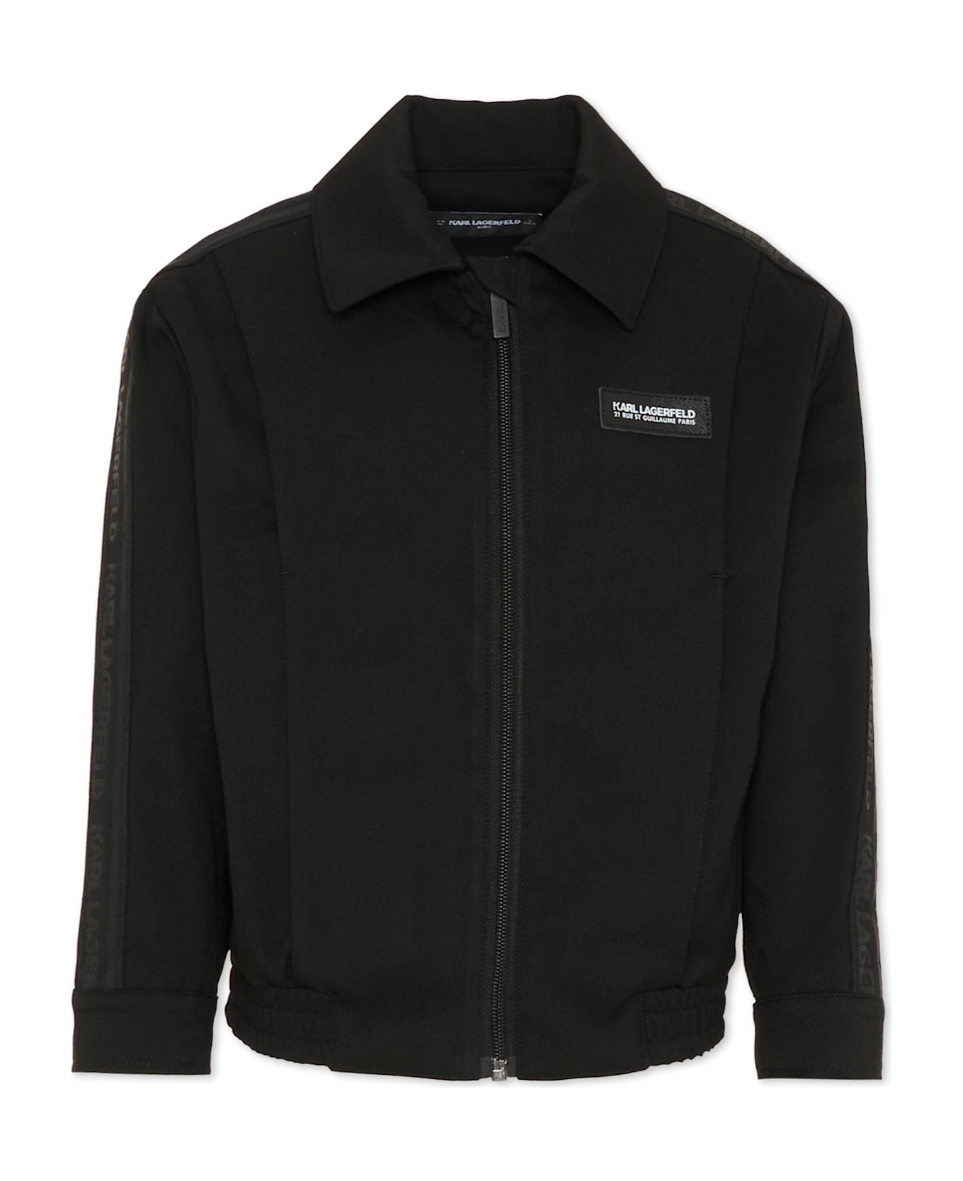 Black twill jacket, long sleeves, with pointed collar, front zip fastening, side pockets, jacquard logo bands on the shoulders and elasticated hem. It is embellished with a logo patch on the chest.