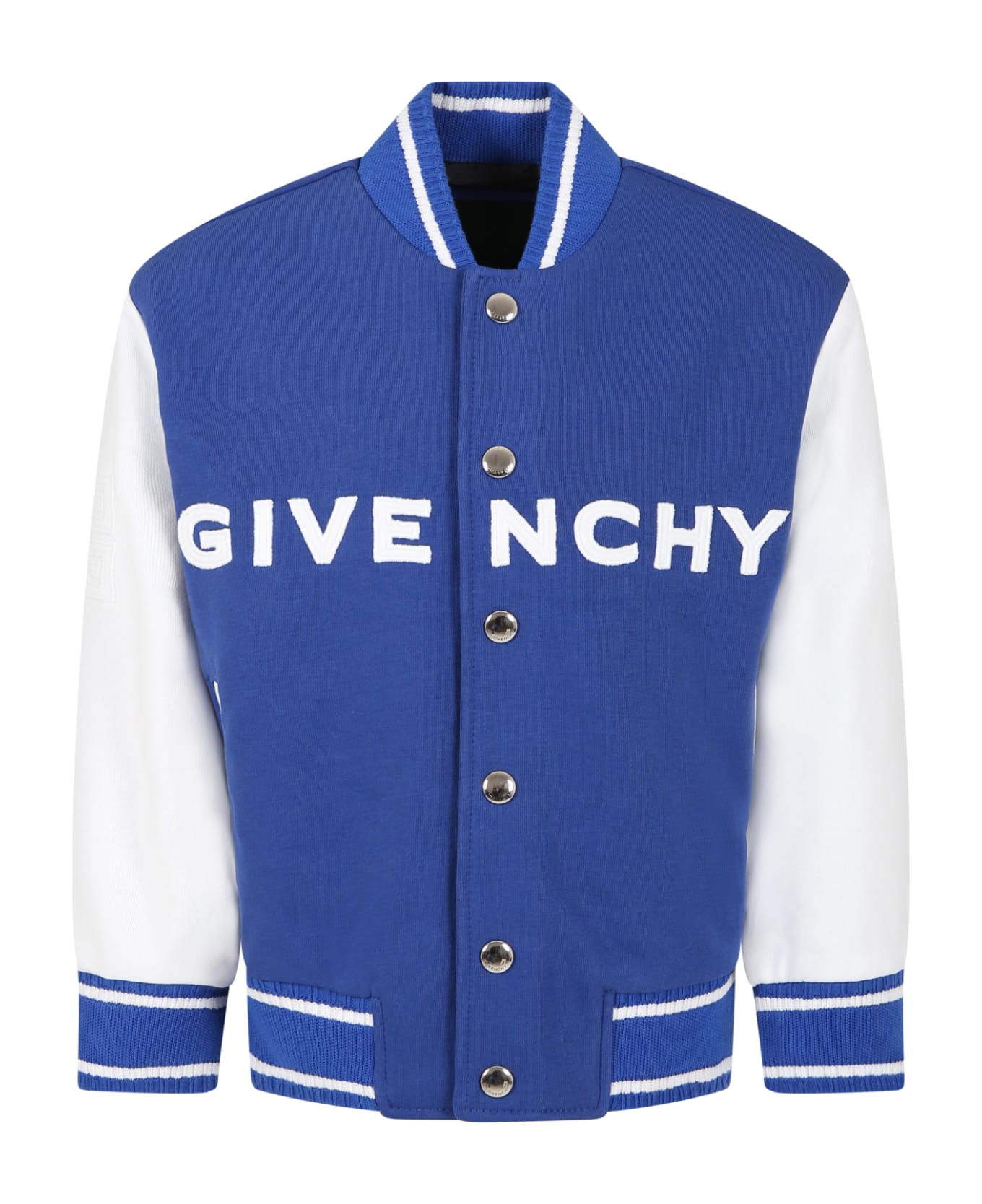 Blue bomber jacket, with white contrasting long sleeves, popper fastening to the front, side pockets, crew neck, cuffs and hemline in blue and white stripes. It is embellished with logo on the front.