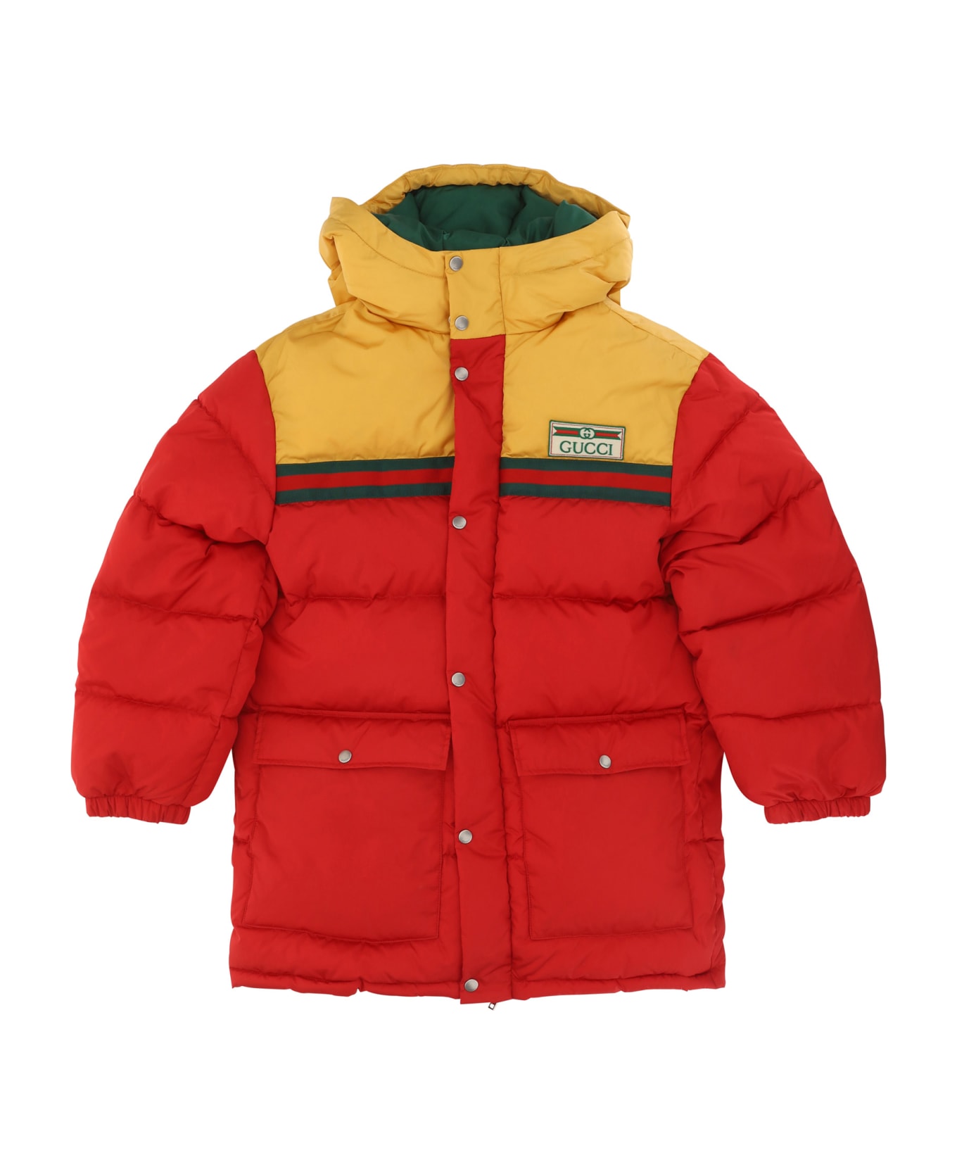 Down jacket for guy by gucci, hooded model, high neck, front closure with snap buttons, two patch pockets on the front, elasticated cuffs, patch with iconic brand logo applied on the front.