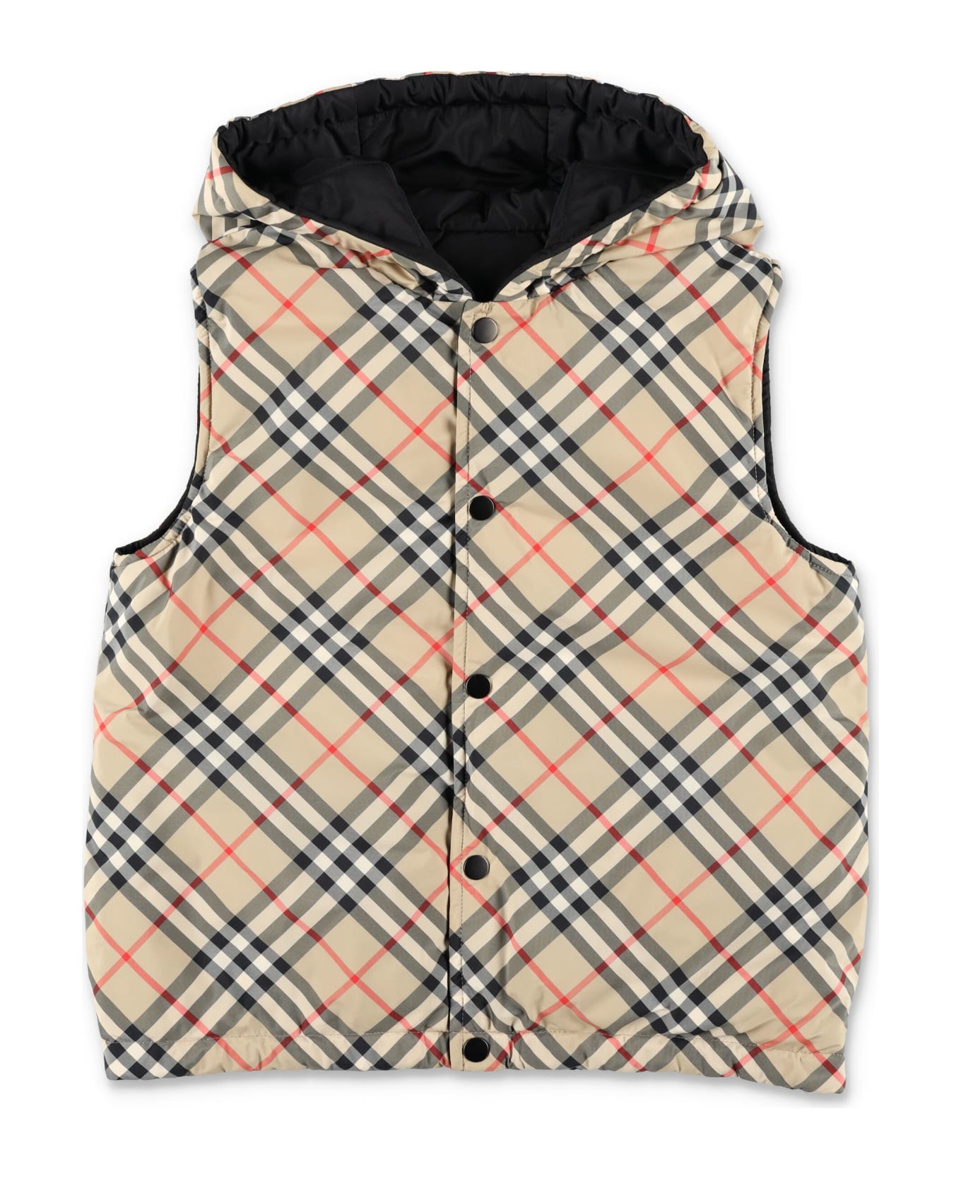 Reversible Check Puffer Gilet By Burberry. Featuring: Fixed Hood Press-stud Closure Side Press-stud Pockets Burberry Check Reversing To A Quilted Solid Color Elasticated Hem