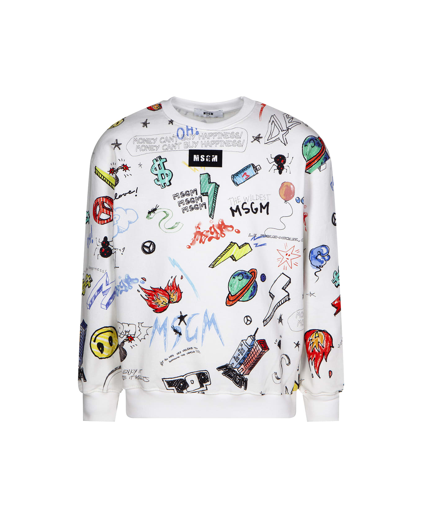 White crew neck sweatshirt by MSGM Kids made of cotton and featuring long sleeves, ribbed profiles, black micro logo box and colorful all-over printed graphic symbols. Composition: 100% Cotton