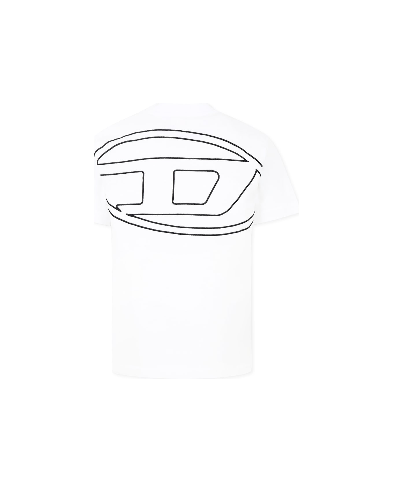 White t-shirt in heavy cotton, with short sleeves and a ribbed crew neck. It is embellished with Diesel logo embroidered on the chest and on the back.
