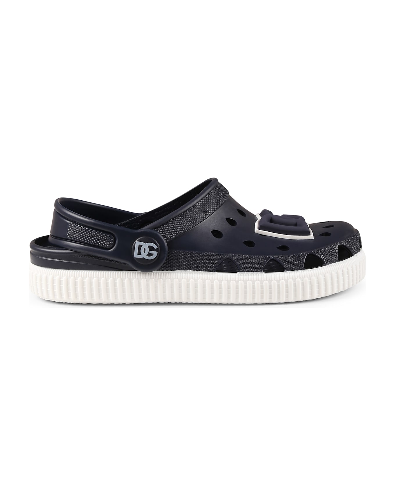 Blue mules from the luxury brand Dolce & Gabbana Kids, in PVC, with heel strap, ventilation holes on the front and round toe. They are embellished with DG logo on the front.