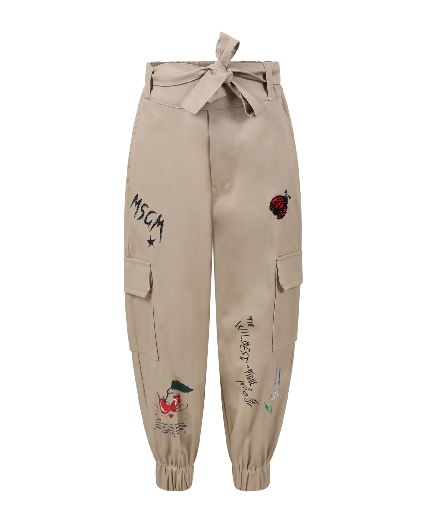 Beige trousers, with elastic waistband, belt loops, logoed belt, side pockets and large pockets, back pocket with flap. They are embellished with multicolor print and ladybug on the front, with side black logo, multicolor print, on the back.