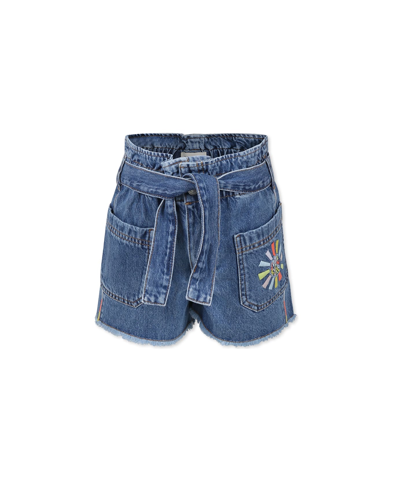 Cotton denim shorts with elasticated waist, snap button and zip front fastening, waist belt, front patch pockets and frayed hems. They are embellished with sun and logo embroidered on the front.