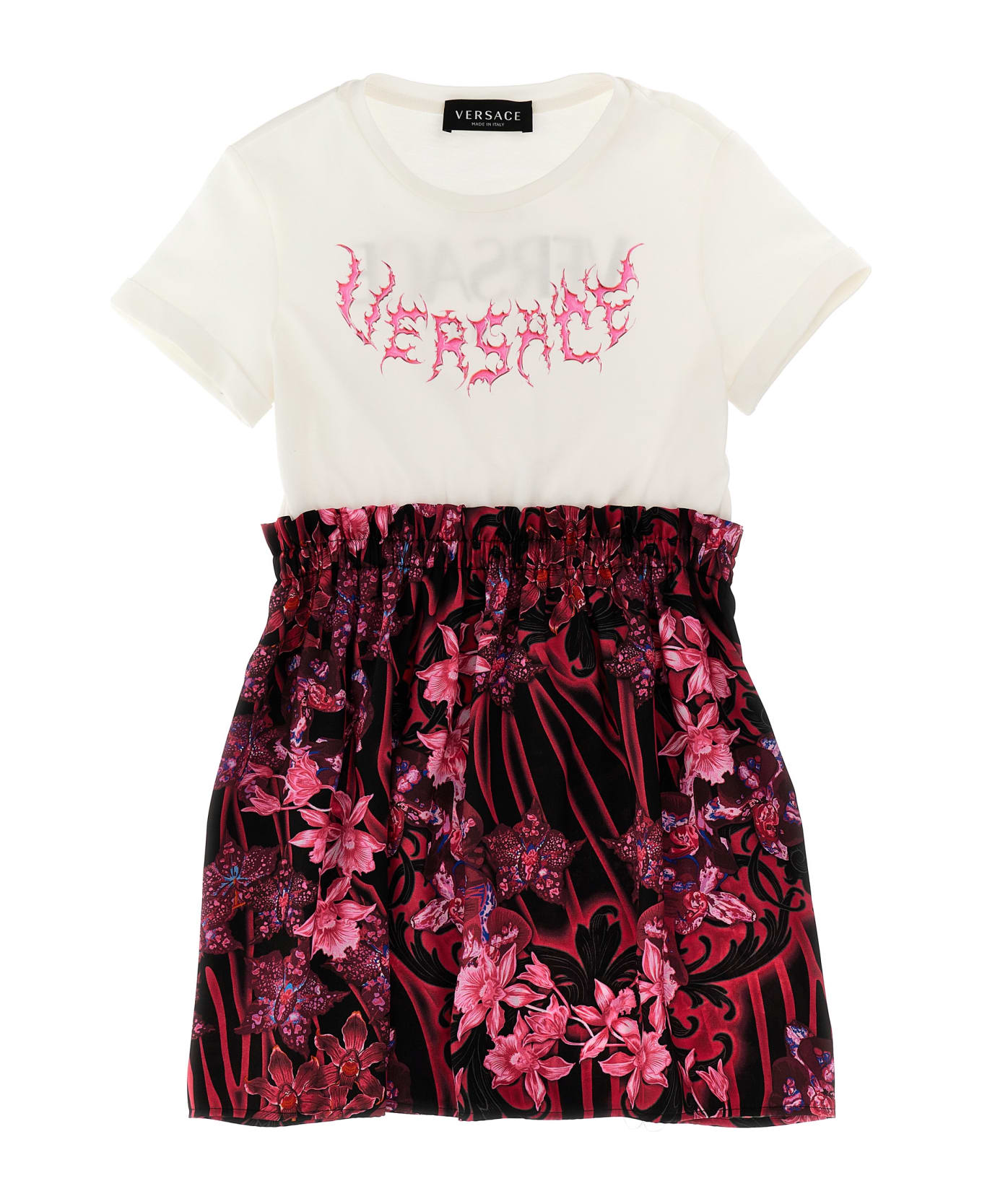 Cotton dress with print at the front and back, a satin skirt with 'Barocco' print, a crewneck, short sleeves and an elastic waistband. Composition: 100% cotton