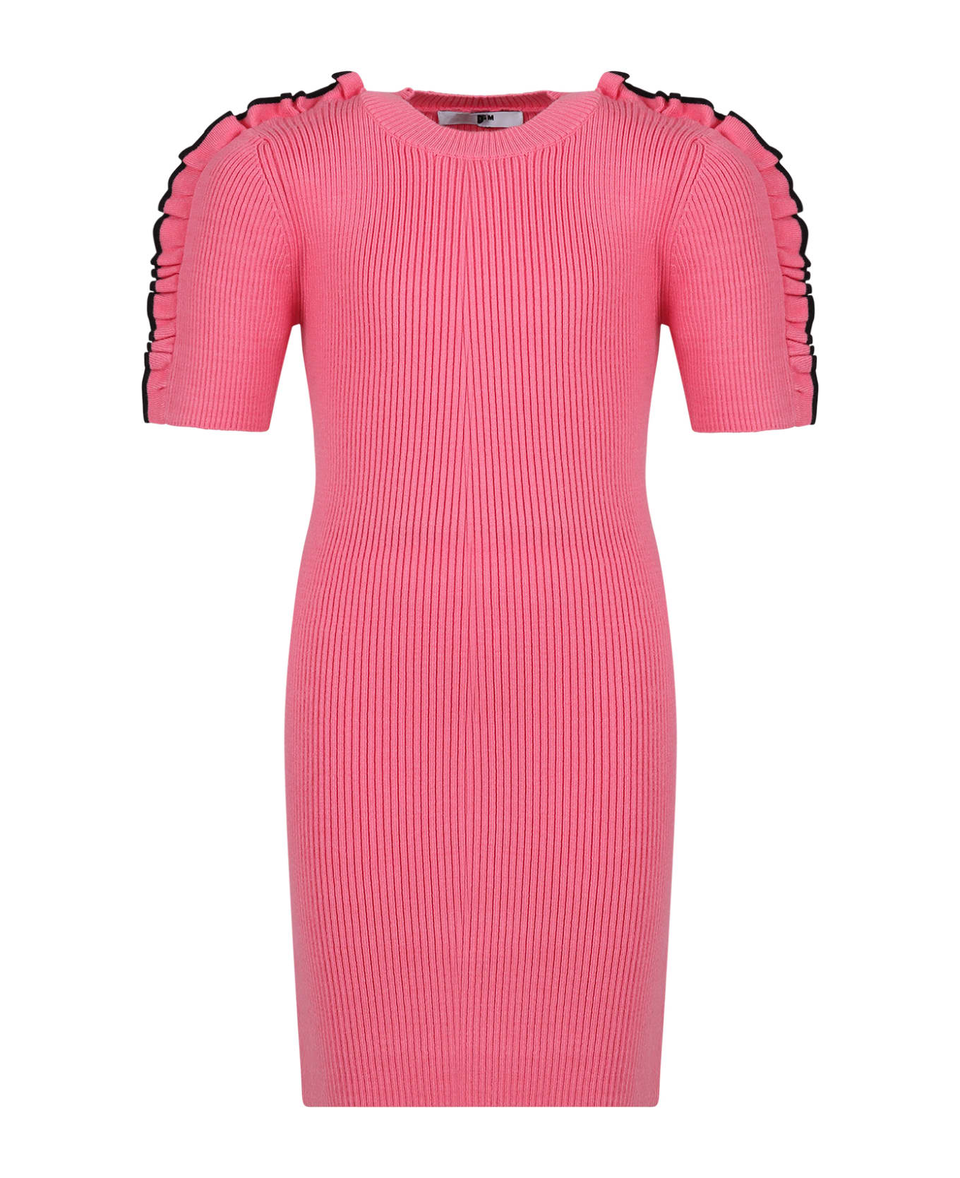 Pink ribbed knit dress with detachable long sleeves and crew neck. He is embellished with ruffles on the sleeves and embroidered logo on the back.