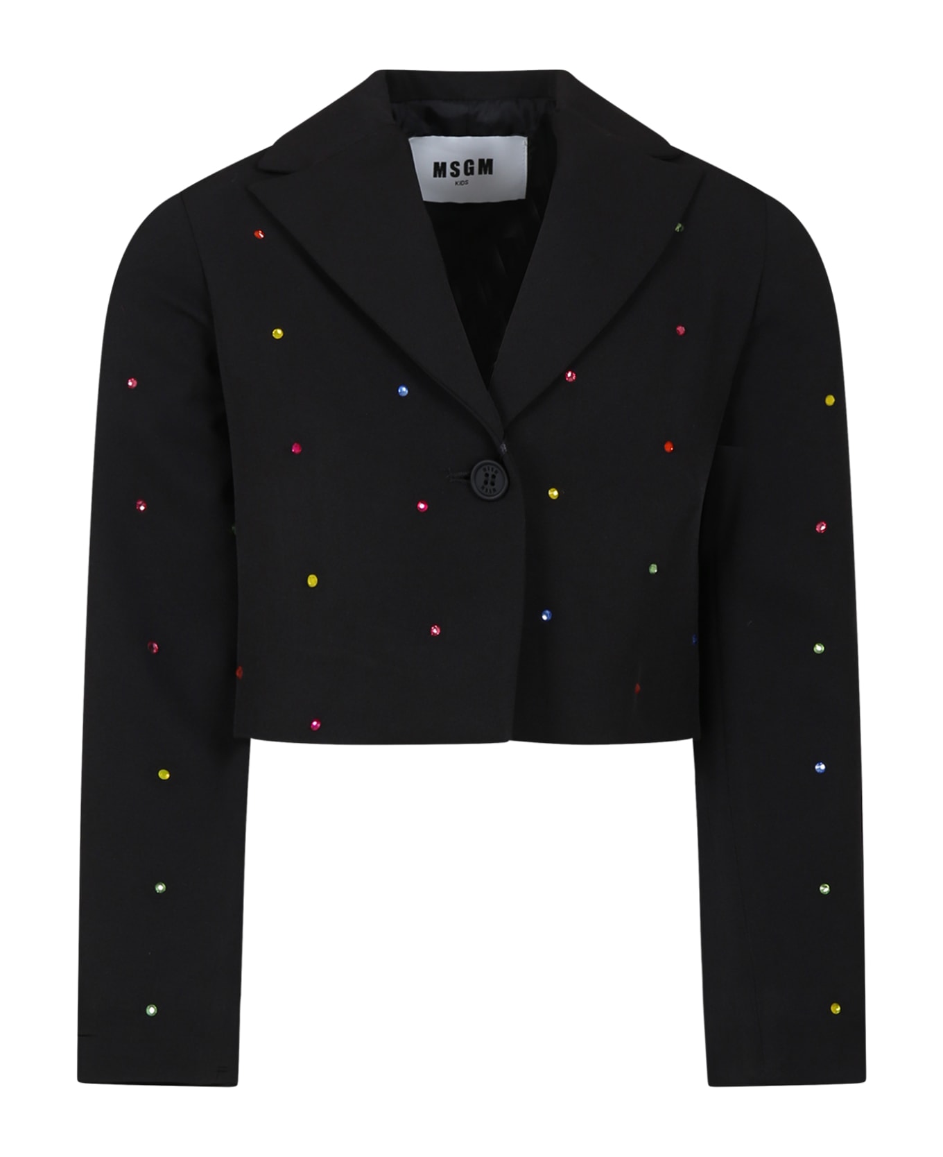 Color: Black Cropped black jacket, with long sleeves, with lapel collar, front closure with button. It is embellished with rhinestones on the front and patch logo on the back. 95% Polyester. 5% Spandex. .