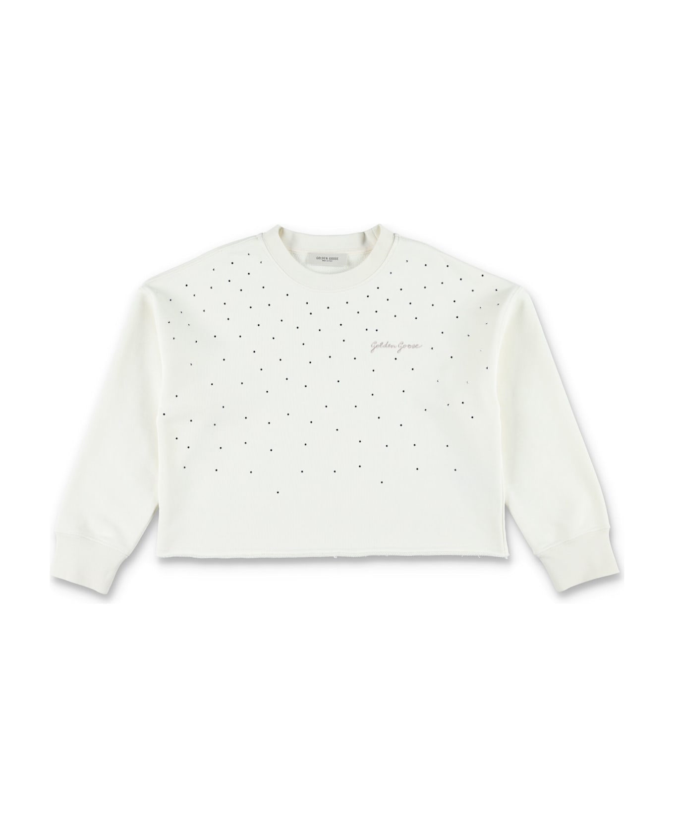 This Golden Goose Kids Sweatshirt Features A Contemporary Cropped Silhouette With A Refined Casual Attitude. Crafted From Soft Ivory Cotton Fleece, It Is Decorated With Rhinstone Embellishment That Adds A Subtle Graphic Texture To The Design. The Embroidered Golden Goose Logo On The Chest Provides A Discreet Signature Detail, While The Crew Neck And Long Sleeves Ensure Everyday Comfort. Cropped Silhouette