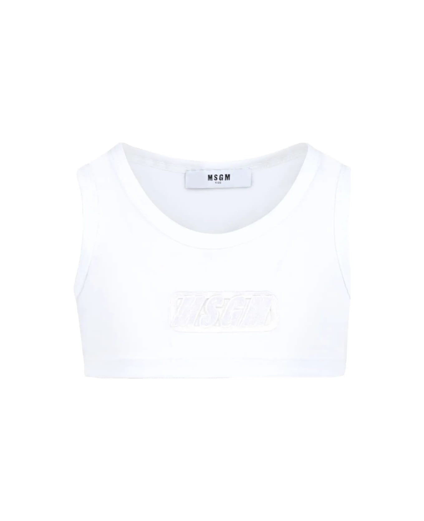 Top con logo applicato Caratteristiche girocollo bianco senza maniche Composizione cotone 100% Istruzioni per il lavaggio Leggi le indicazioni del produttore