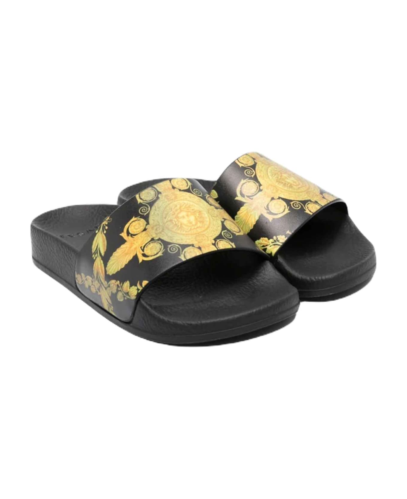 Black/gold sandals unisex Kids. Open toe and Medusa Head print. 100% rubber sole