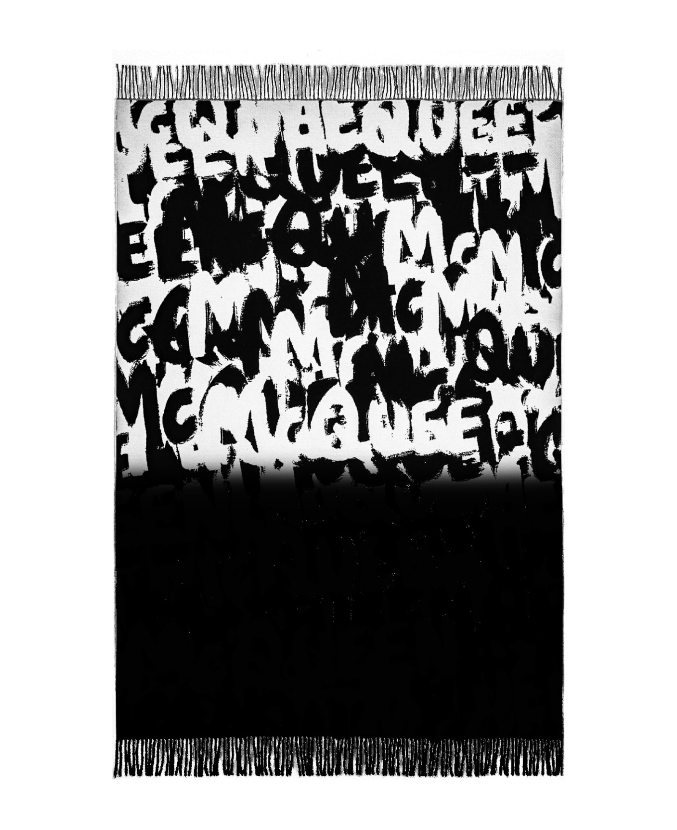 Alexander McQueen throw made of black wool with shaded ivory McQueen Graffiti motif and fringed edges.