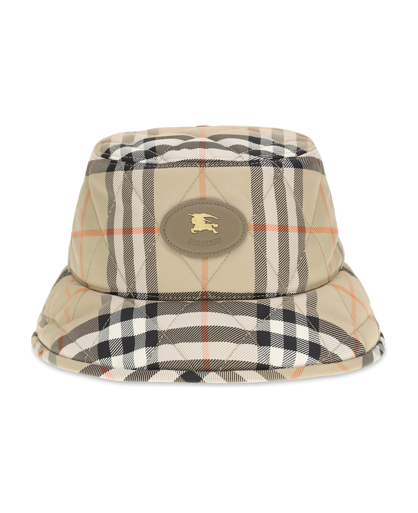 The horseshoe quilted bucket hat by burberry combines contemporary style with practicality. crafted from quilted nylon with the classic burberry check pattern in sand beige, it is embellished with a tone-on-tone leather knight stamp detail. perfect for completing casual-chic looks with a distinctive and iconic touch from the brand.