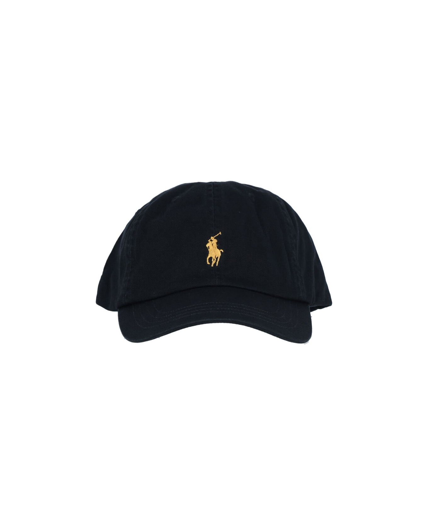 Polo Ralph Lauren logo baseball cap in black cotton with curved visor, gold logo embroidery on the front, gold logo embroidery on the back, and adjustable strap on the back.