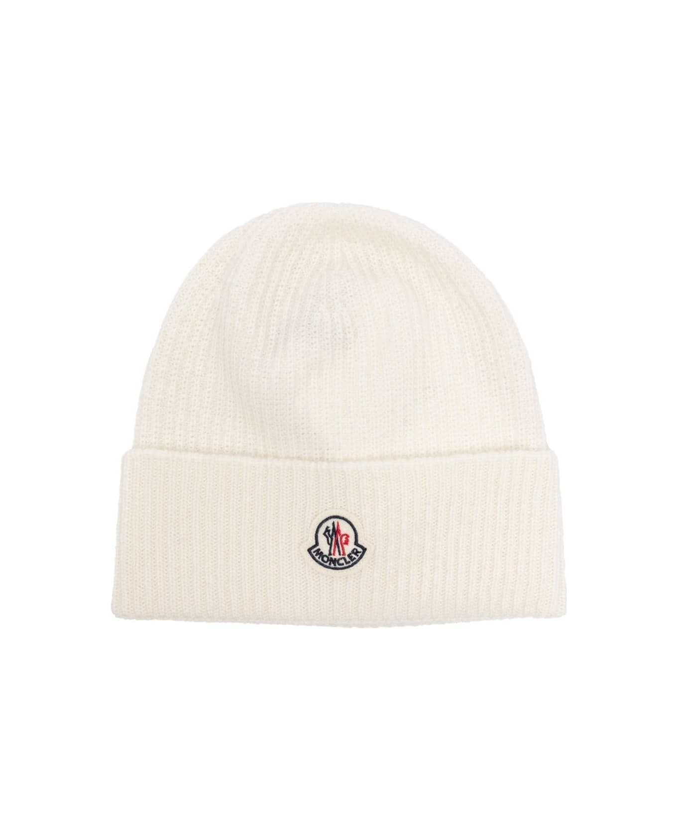 Moncler turn-up beanie made from a wool and cashmere blend yarn (gauge 7) in white. Brioche stitch work. The medium-weight knitted accessory is decorated with the felt logo patch. Composition: Composition: 70% Virgin Wool, 30% Cashmere.