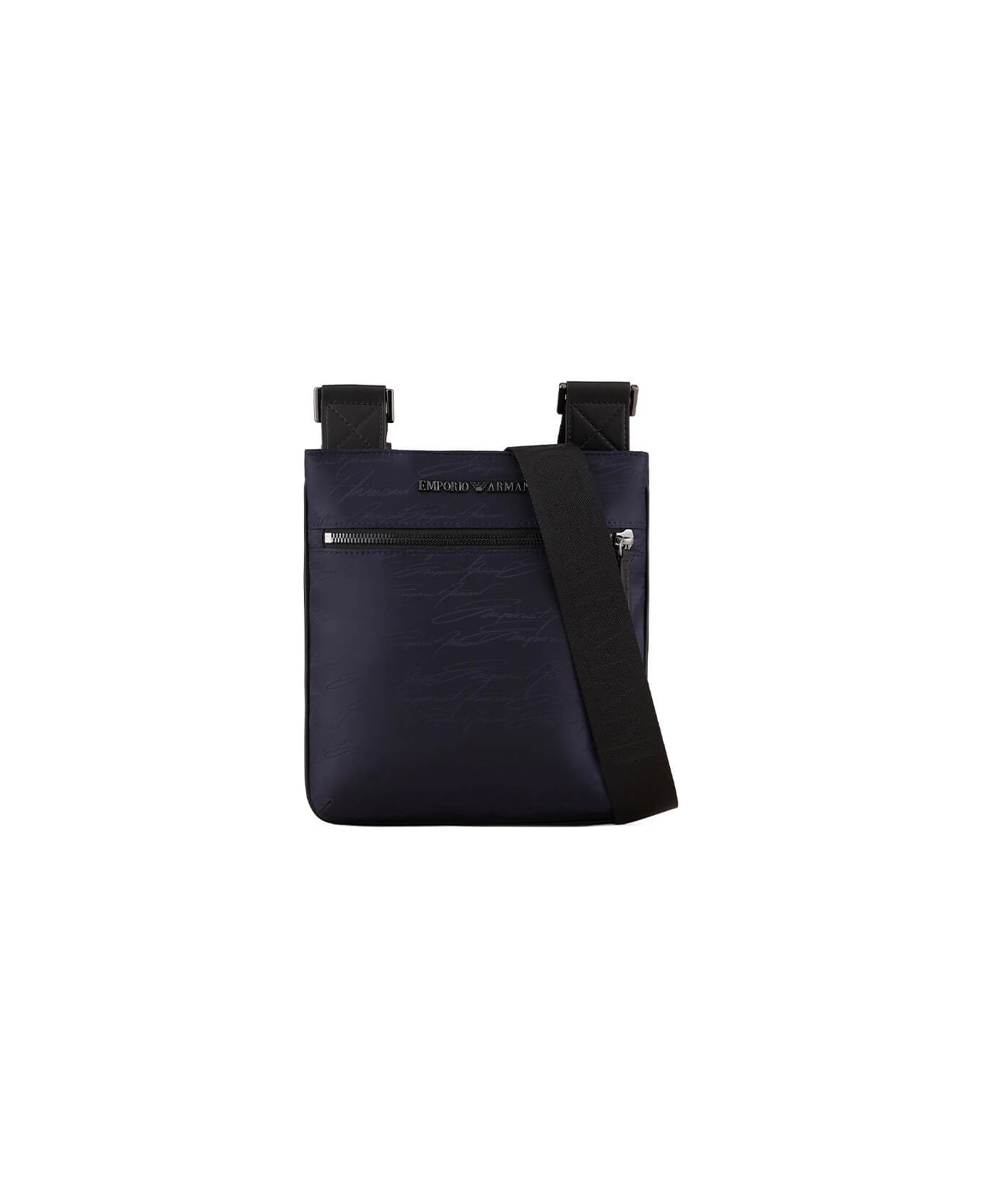 Crossbody bag by Emporio Armani made of navy blue nylon with all over logo. Flat pocket on the front and zip closure. Adjustable shoulder strap, size 11x18x3,5 cm. Composition: 100% polyamide.