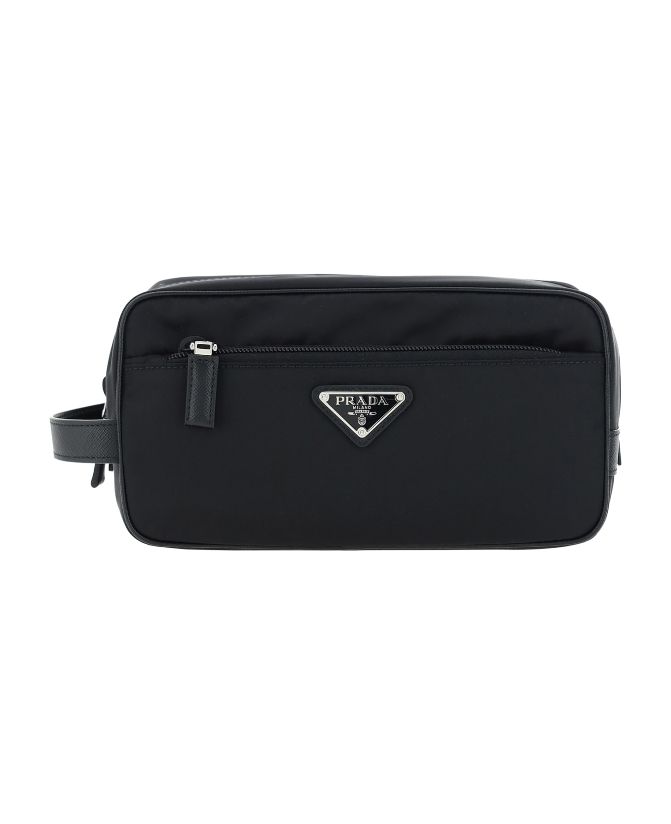 Re-nylon beauty case by prada, top zipper closure, triangular logo plaque applique on front, one welt pocket on front with zipper for closure, leather details. Composition: 100% % Polyamide