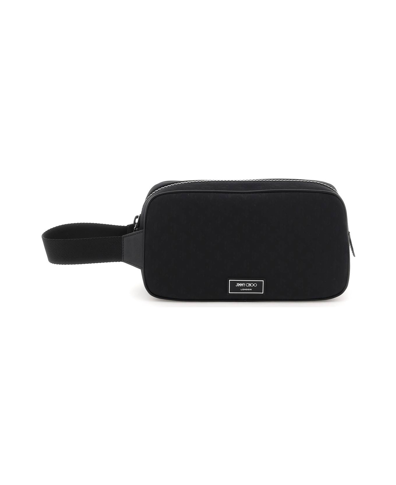 Vanity case by Jimmy Choo crafted in fabric with all-over embossed JC monogram. Zippered closure, satin interior with an open pocket and tone-on-tone metalware. Composition: 75% TR, 20% LH, 5% BR