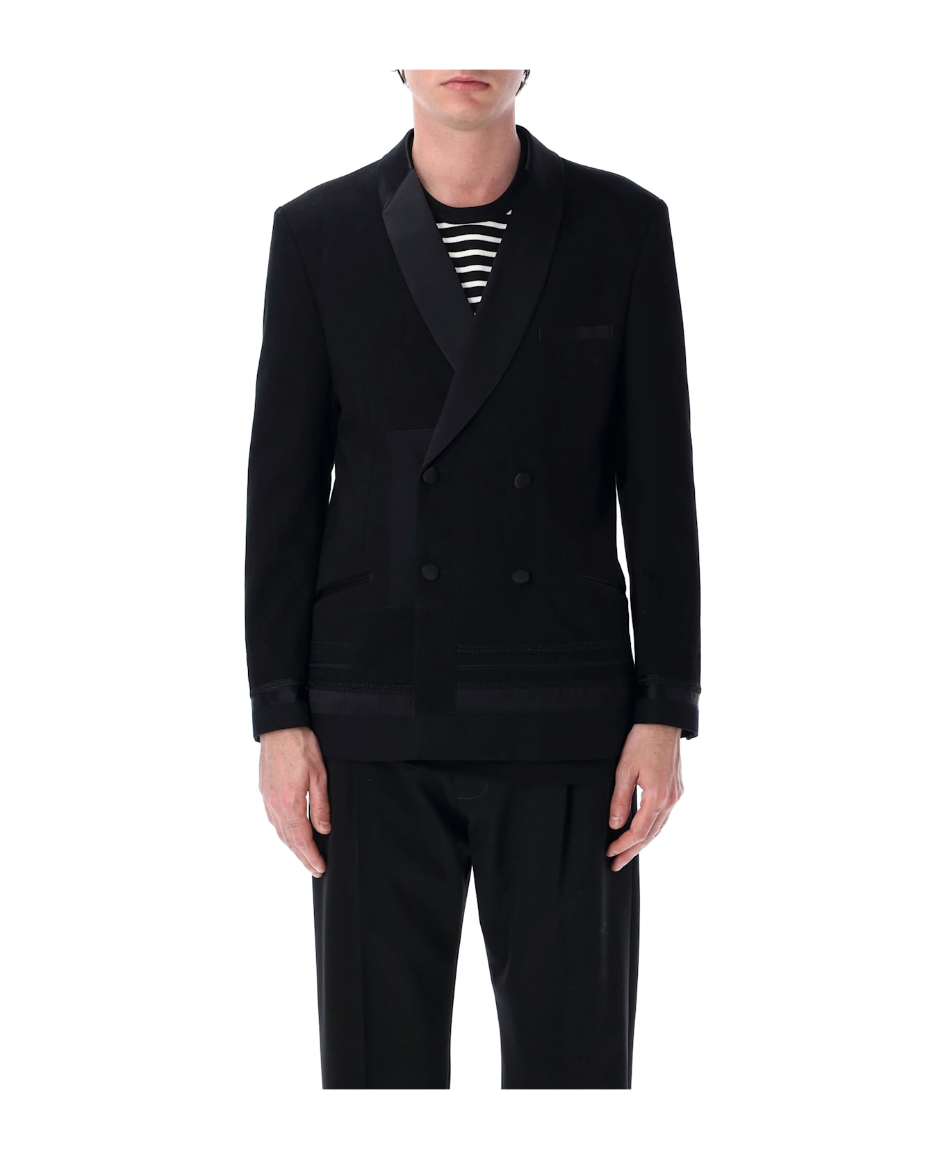 Cotton Double Breasted Blazer By Junya Watanabe. Featuring: Shawl Collar Double Breasted Covered Satin Buttons Four Buttons Cuffs Tonal Trimmings Inserts At Cuffs And Hem Chest Pockets Front Welt Pockets Satin Collar And Pockets Edges Slim Fit Model Is 1,90 M And Wears Size Xl