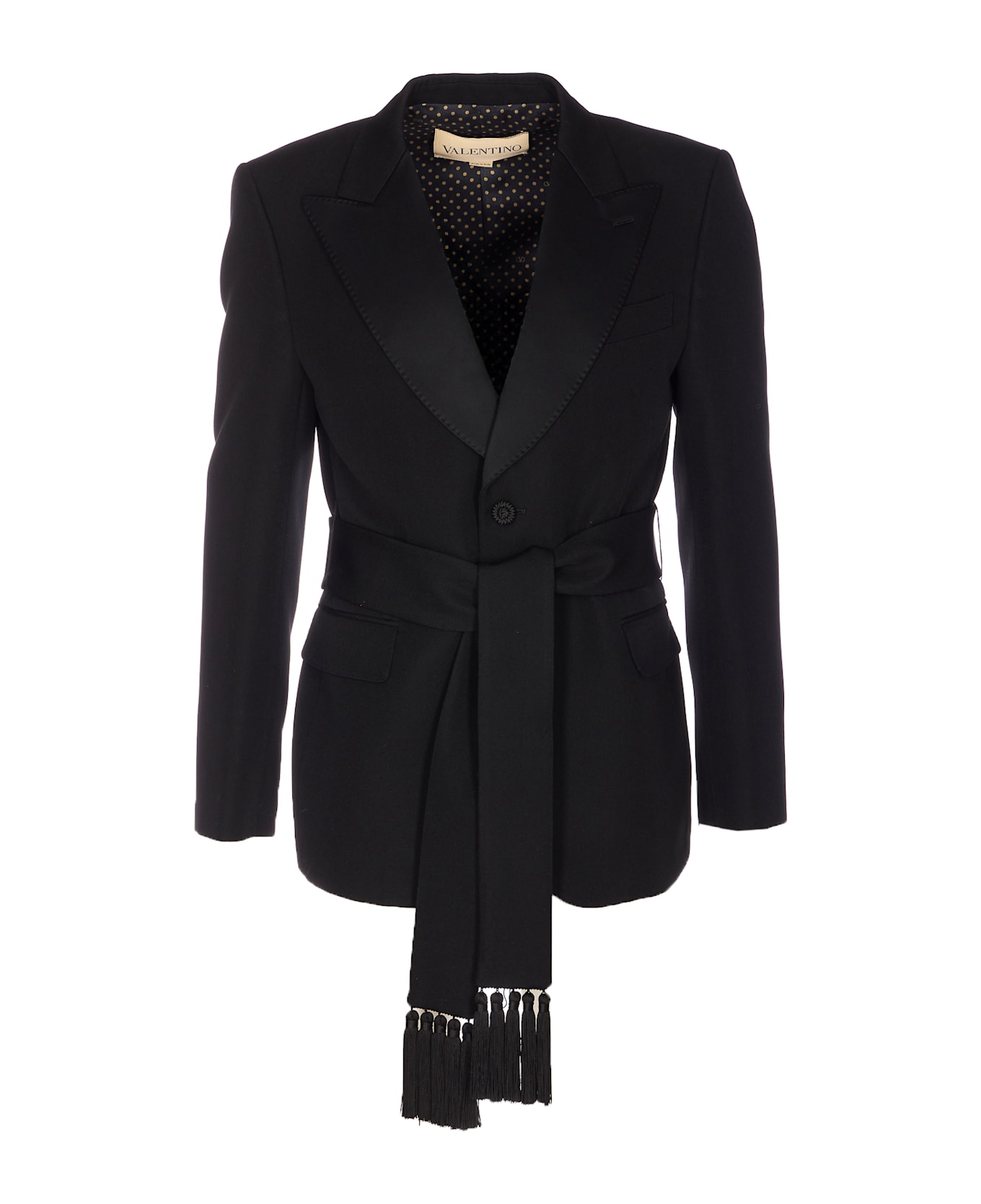 Valentino Garavani black jacket, buttons on the front, V-neck, long sleeves, buttons on cuffs, sash on waist with fringes details, pockets