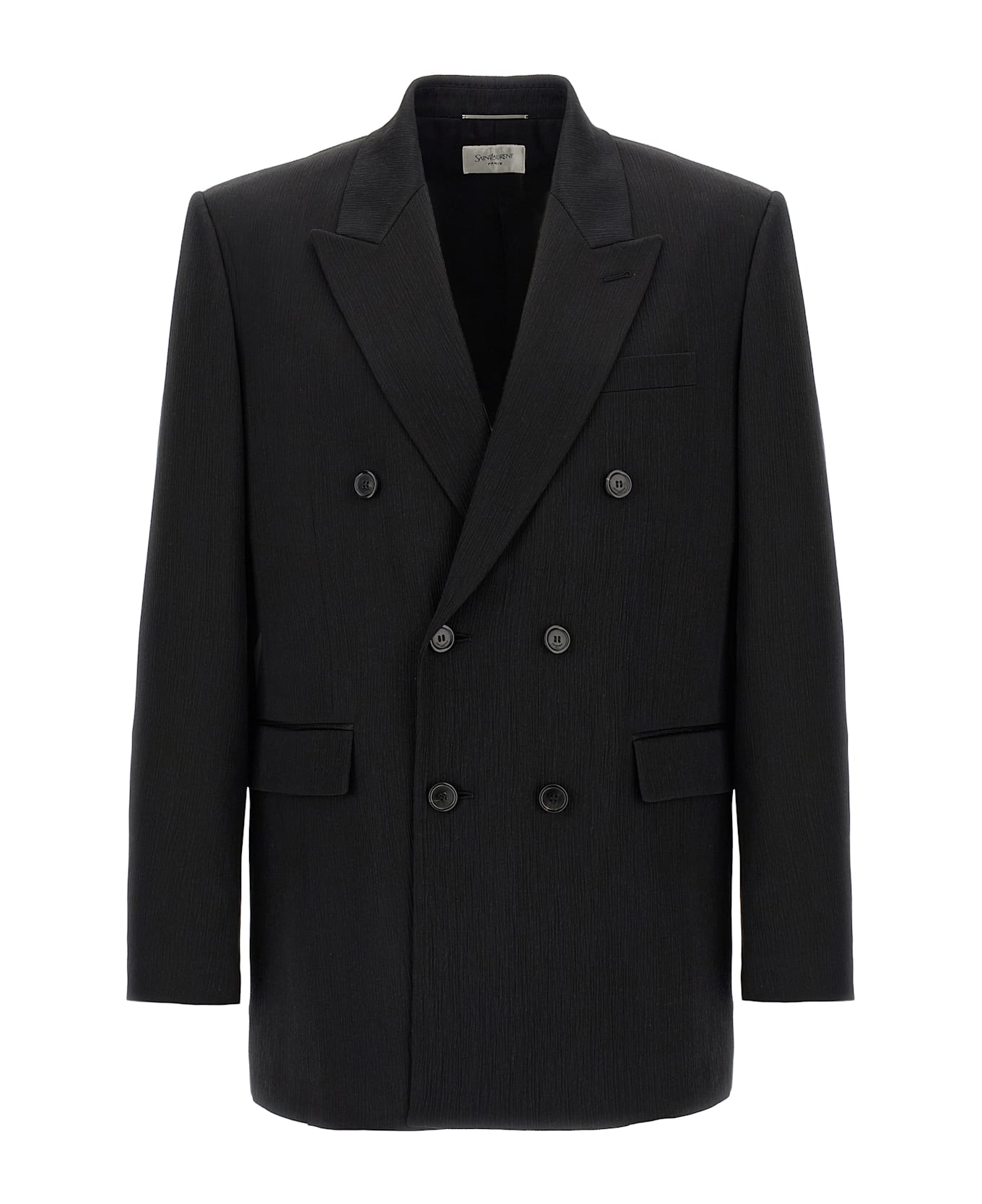Double-breasted blazer in silk crépon satin with front button closure, breast pocket, peak lapels, flap pockets, cuffs with opening buttonholes, silk lining, padded shoulder, and two inside pockets.